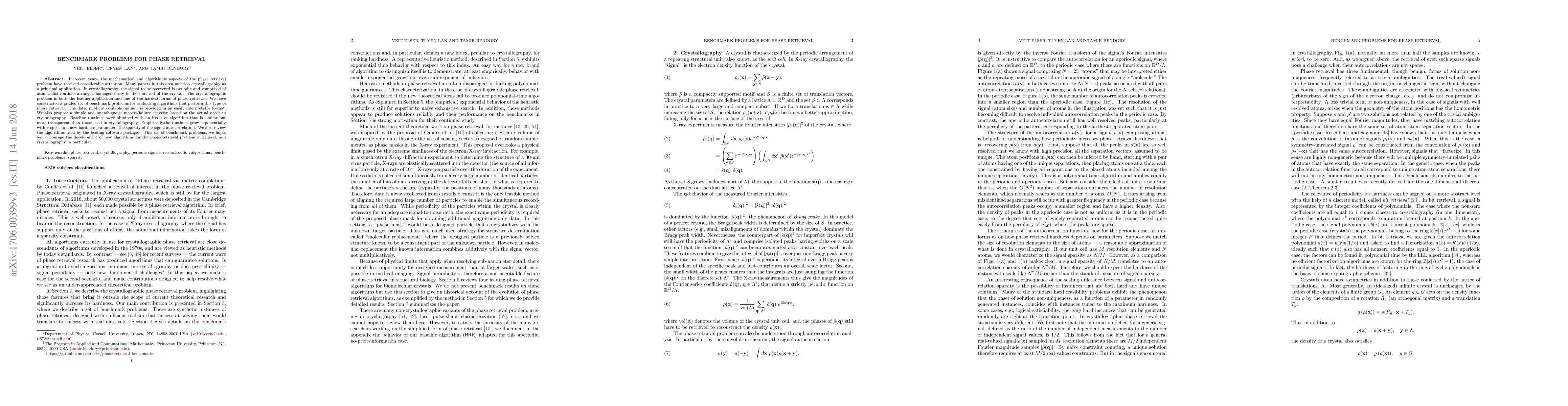 This paper presents a set of benchmark problems for evaluating phase retrieval algorithms, particularly for crystallography. It introduces a new hardness parameter based on signal sparsity and provides baseline runtimes, showing exponential growth with this parameter. The authors also review leading software algorithms, aiming to foster development of new phase retrieval methods.