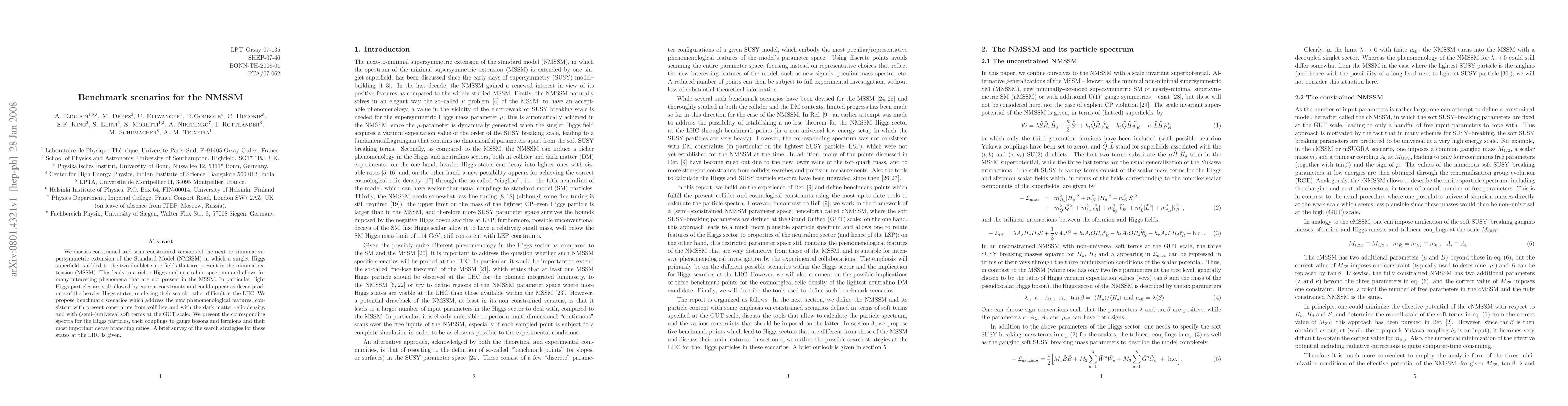 This paper explores constrained and semi-constrained versions of the NMSSM, a supersymmetric extension of the Standard Model. It proposes benchmark scenarios consistent with current constraints from colliders and dark matter relic density, detailing spectra, couplings, and decay branching ratios of Higgs particles. The study also surveys LHC search strategies for these states.