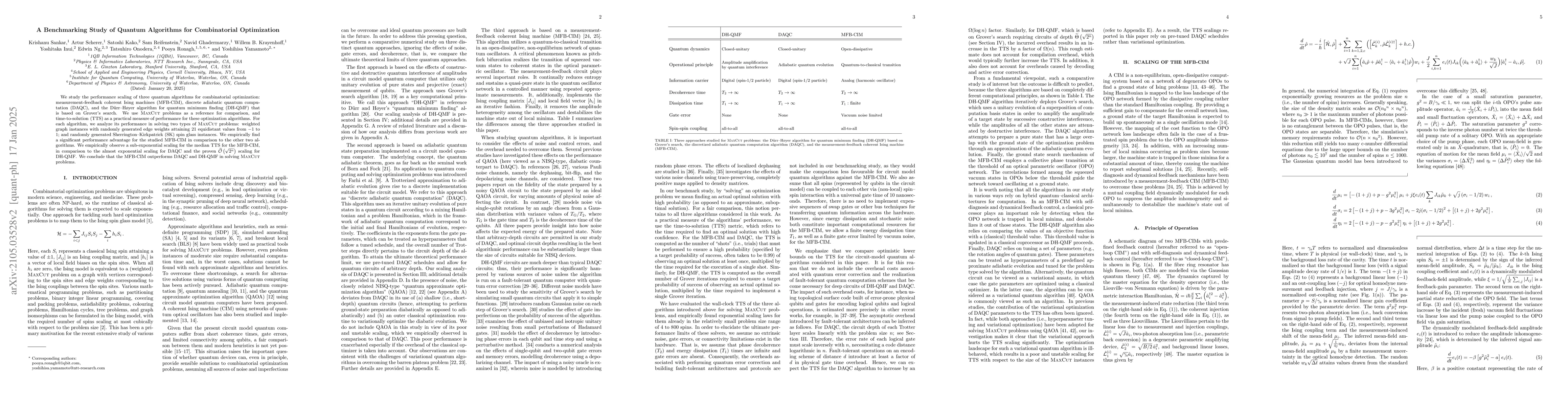We study the performance scaling of three quantum algorithms for combinatorial optimization: measurement-feedback coherent Ising machines (MFB-CIM), discrete adiabatic quantum computation (DAQC), and the D\"urr-Hoyer algorithm for quantum minimum finding (DH-QMF) that is based on Grover's search. We use MaxCut problems as our reference for comparison, and time-to-solution (TTS) as a practical measure of performance for these optimization algorithms. We empirically observe a $\Theta(2^{\sqrt{n}})$ scaling for the median TTS for MFB-CIM, in comparison to the exponential scaling with the exponent $n$ for DAQC and the provable $\widetilde{\mathcal O}\left(\sqrt{2^n}\right)$ scaling for DH-QMF. We conclude that these scaling complexities result in a dramatic performance advantage for MFB-CIM in comparison to the other two algorithms for solving MaxCut problems.