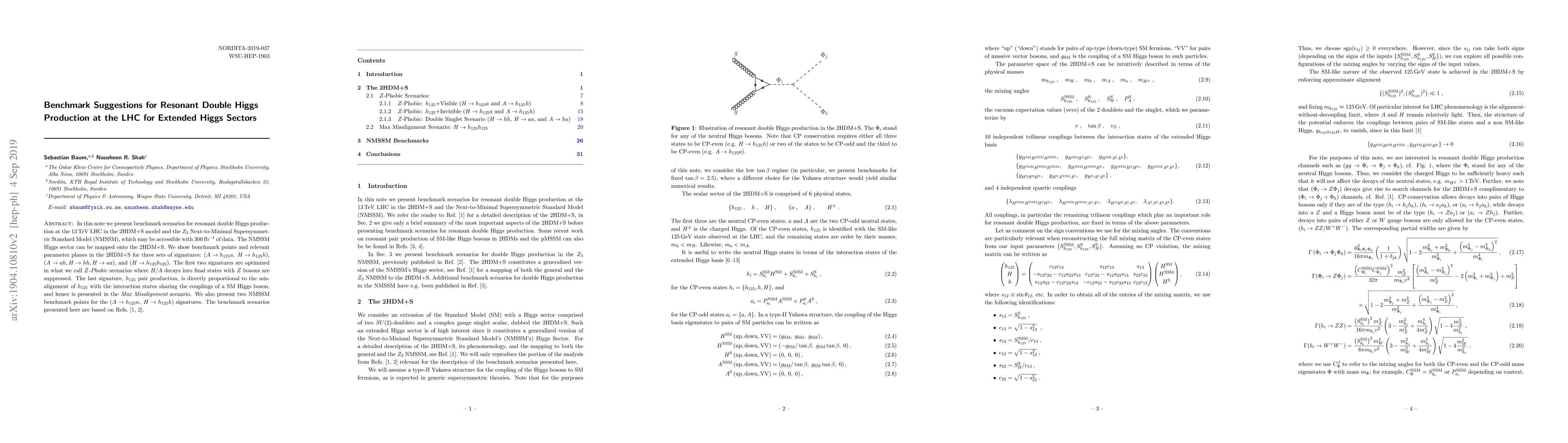 In this note we present benchmark scenarios for resonant double Higgs production at the $13\,$TeV LHC in the 2HDM+S model and the $Z_3$ Next-to-Minimal Supersymmetric Standard Model (NMSSM), which may be accessible with 300 fb$^{-1}$ of data. The NMSSM Higgs sector can be mapped onto the 2HDM+S. We show benchmark points and relevant parameter planes in the 2HDM+S for three sets of signatures: ($A\to h_{125} a, ~H\to h_{125} h)$, ($A\to a h, H\to hh, H\to aa)$, and ($H\to h_{125}h_{125}$). The first two signatures are optimized in what we call $Z$-Phobic scenarios where $H/A$ decays into final states with $Z$ bosons are suppressed. The last signature, $h_{125}$ pair production, is directly proportional to the misalignment of $h_{125}$ with the interaction state sharing the couplings of a SM Higgs boson, and hence is presented in the Max Misalignment scenario. We also present two NMSSM benchmark points for the ($A\to h_{125} a, ~H\to h_{125} h)$ signatures. The benchmark scenarios presented here are based on Refs. [1,2].