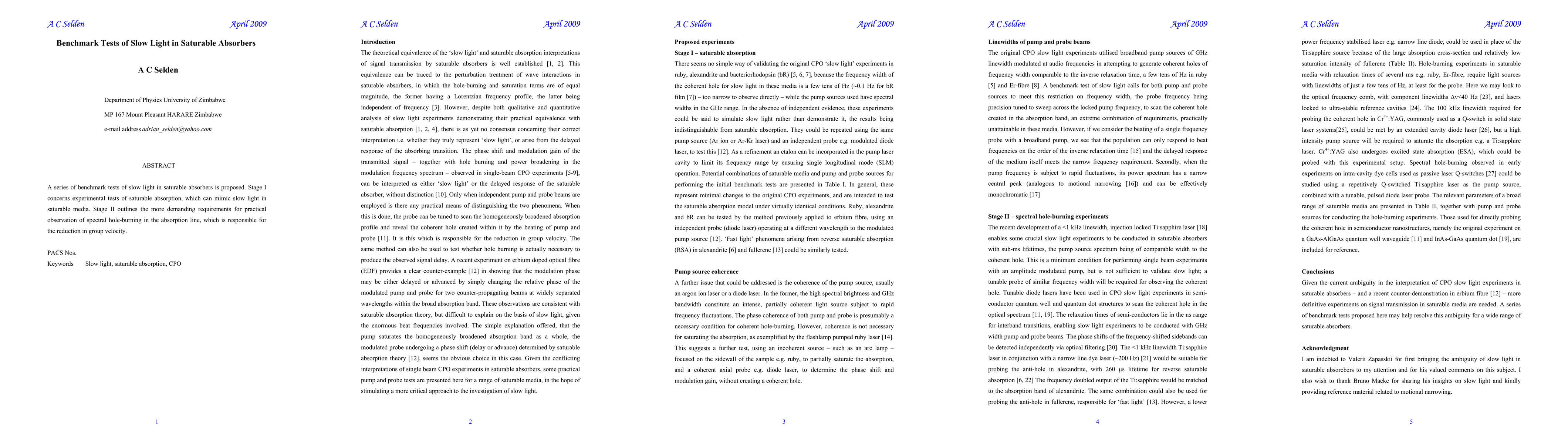 This paper proposes benchmark tests for slow light in saturable absorbers, focusing on experimental verification of saturable absorption in Stage I and the requirements for observing spectral hole-burning in Stage II to achieve reduced group velocity.