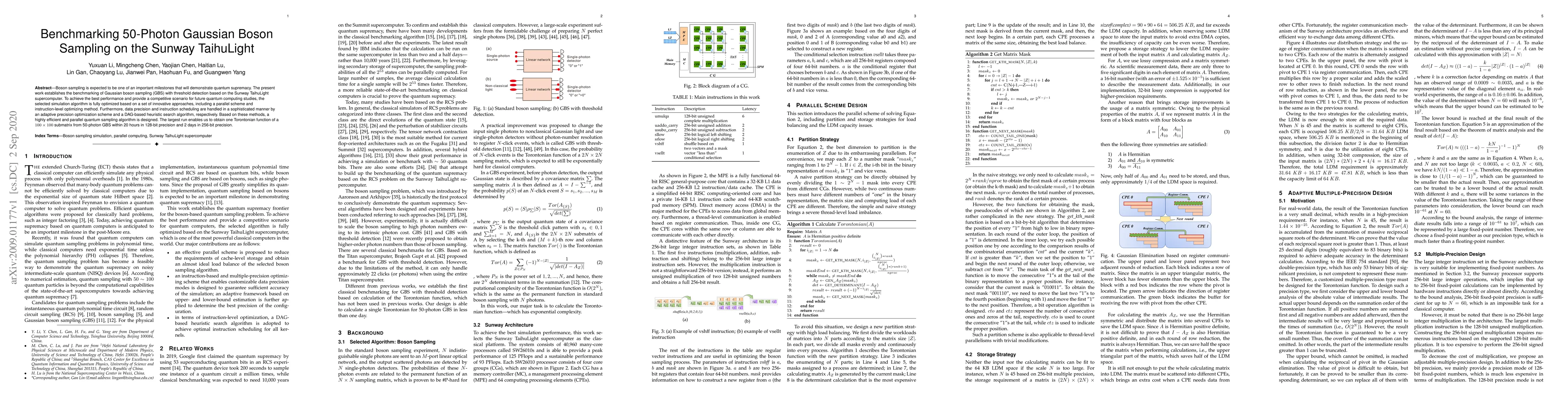 This paper benchmarks Gaussian boson sampling (GBS) on the Sunway TaihuLight supercomputer, optimizing the simulation algorithm with parallel processing and adaptive precision techniques. The study achieves efficient sampling of a 50-photon GBS, generating a 100 x 100 submatrix Torontonian function in 20 hours at 128-bit precision and 2 days at 256-bit precision.
