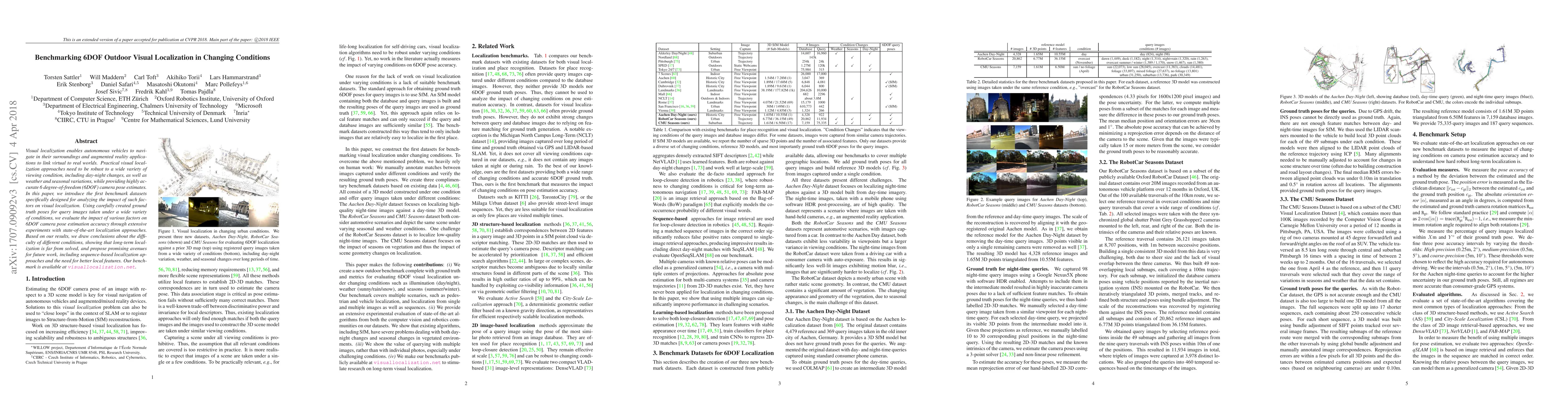 This paper introduces benchmark datasets for evaluating 6DOF outdoor visual localization under various changing conditions, including day-night changes and seasonal variations. The study highlights the challenges in long-term localization and proposes future research directions, including sequence-based localization and improved local features.