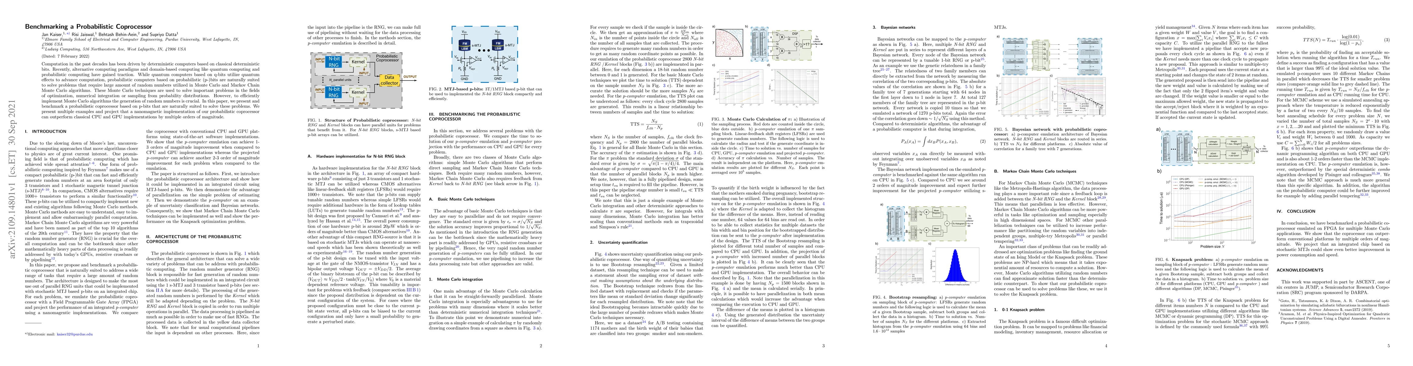 Computation in the past decades has been driven by deterministic computers based on classical deterministic bits. Recently, alternative computing paradigms and domain-based computing like quantum computing and probabilistic computing have gained traction. While quantum computers based on q-bits utilize quantum effects to advance computation, probabilistic computers based on probabilistic (p-)bits are naturally suited to solve problems that require large amount of random numbers utilized in Monte Carlo and Markov Chain Monte Carlo algorithms. These Monte Carlo techniques are used to solve important problems in the fields of optimization, numerical integration or sampling from probability distributions. However, to efficiently implement Monte Carlo algorithms the generation of random numbers is crucial. In this paper, we present and benchmark a probabilistic coprocessor based on p-bits that are naturally suited to solve these problems. We present multiple examples and project that a nanomagnetic implementation of our probabilistic coprocessor can outperform classical CPU and GPU implementations by multiple orders of magnitude.