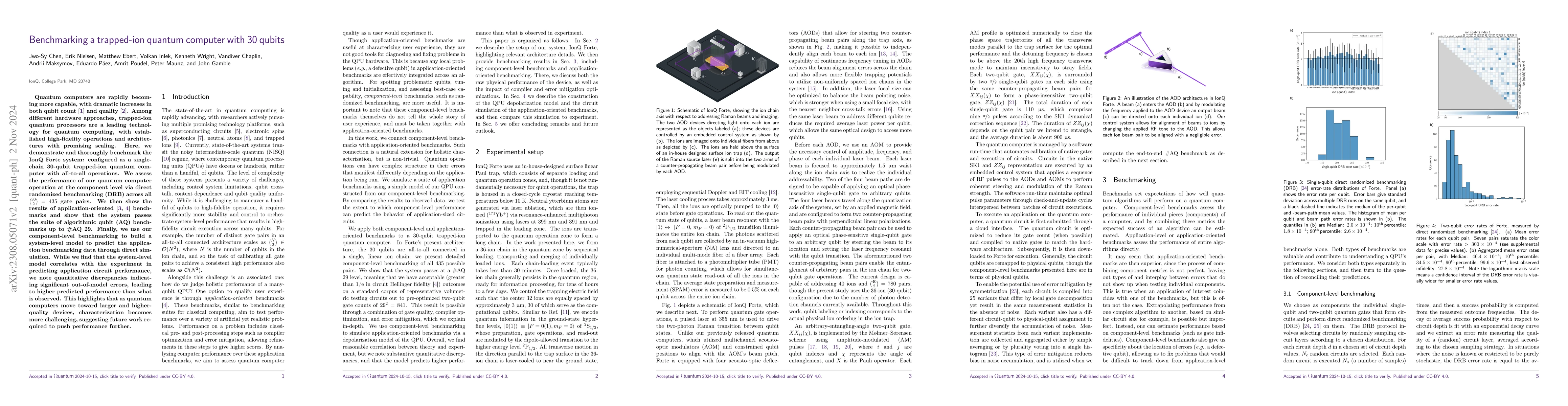 Quantum computers are rapidly becoming more capable, with dramatic increases in both qubit count and quality. Among different hardware approaches, trapped-ion quantum processors are a leading technology for quantum computing, with established high-fidelity operations and architectures with promising scaling. Here, we demonstrate and thoroughly benchmark the IonQ Forte system: configured here as a single-chain 30-qubit trapped-ion quantum computer with all-to-all operations. We assess the performance of our quantum computer operation at the component level via direct randomized benchmarking (DRB) across all 30 choose 2 = 435 gate pairs. We then show the results of application-oriented benchmarks, indicating that the system passes the suite of algorithmic qubit (AQ) benchmarks up to #AQ 29. Finally, we use our component-level benchmarking to build a system-level model to predict the application benchmarking data through direct simulation, including error mitigation. We find that the system-level model correlates well with the observations in many cases, though in some cases out-of-model errors lead to higher predicted performance than is observed. This highlights that as quantum computers move toward larger and higher-quality devices, characterization becomes more challenging, suggesting future work required to push performance further.