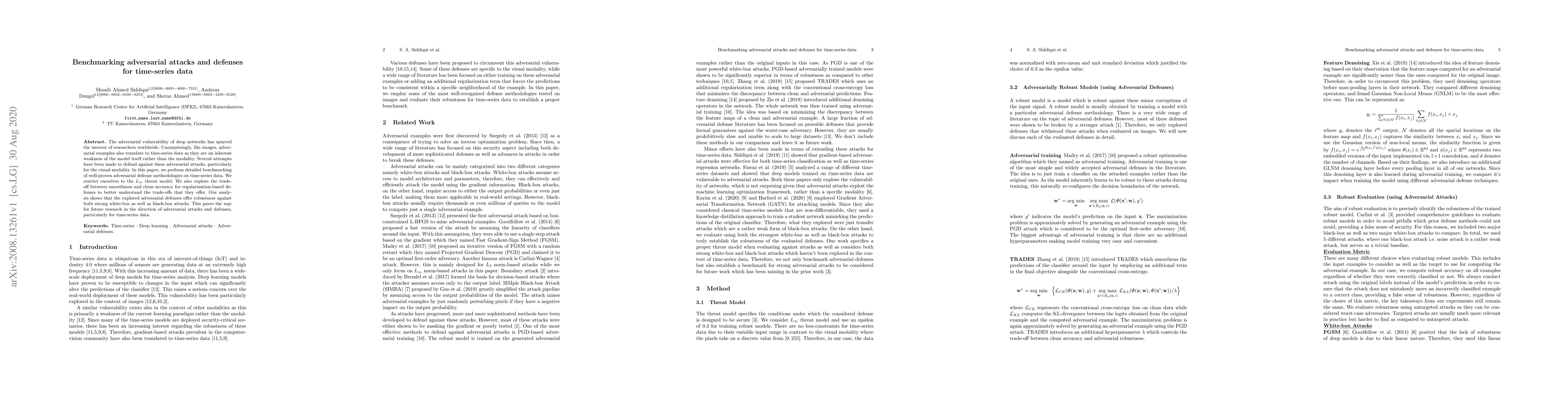 The adversarial vulnerability of deep networks has spurred the interest of researchers worldwide. Unsurprisingly, like images, adversarial examples also translate to time-series data as they are an inherent weakness of the model itself rather than the modality. Several attempts have been made to defend against these adversarial attacks, particularly for the visual modality. In this paper, we perform detailed benchmarking of well-proven adversarial defense methodologies on time-series data. We restrict ourselves to the $L_{\infty}$ threat model. We also explore the trade-off between smoothness and clean accuracy for regularization-based defenses to better understand the trade-offs that they offer. Our analysis shows that the explored adversarial defenses offer robustness against both strong white-box as well as black-box attacks. This paves the way for future research in the direction of adversarial attacks and defenses, particularly for time-series data.