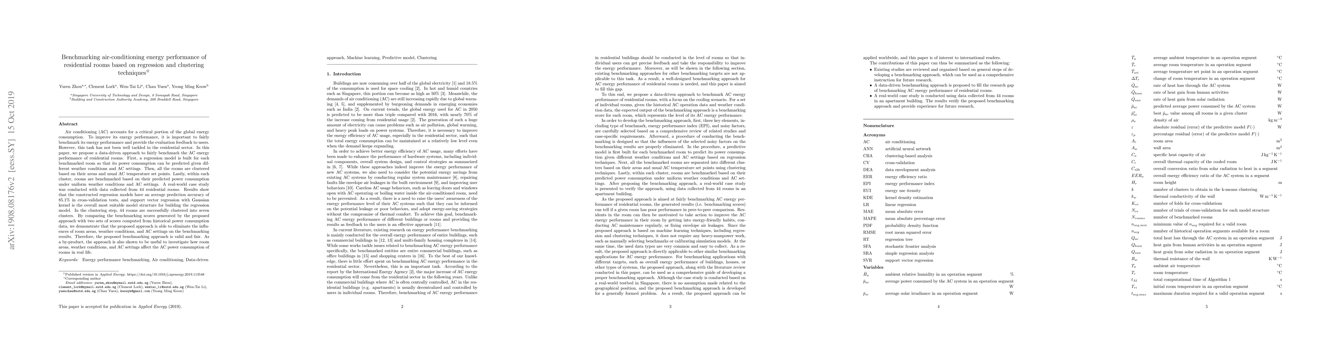 Air conditioning (AC) accounts for a critical portion of the global energy consumption. To improve its energy performance, it is important to fairly benchmark its energy performance and provide the evaluation feedback to users. However, this task has not been well tackled in the residential sector. In this paper, we propose a data-driven approach to fairly benchmark the AC energy performance of residential rooms. First, regression model is built for each benchmarked room so that its power consumption can be predicted given different weather conditions and AC settings. Then, all the rooms are clustered based on their areas and usual AC temperature set points. Lastly, within each cluster, rooms are benchmarked based on their predicted power consumption under uniform weather conditions and AC settings. A real-world case study was conducted with data collected from 44 residential rooms. Results show that the constructed regression models have an average prediction accuracy of 85.1% in cross-validation tests, and support vector regression with Gaussian kernel is the overall most suitable model structure for building the regression model. In the clustering step, 44 rooms are successfully clustered into seven clusters. By comparing the benchmarking scores generated by the proposed approach with two sets of scores computed from historical power consumption data, we demonstrate that the proposed approach is able to eliminate the influences of room areas, weather conditions, and AC settings on the benchmarking results. Therefore, the proposed benchmarking approach is valid and fair. As a by-product, the approach is also shown to be useful to investigate how room areas, weather conditions, and AC settings affect the AC power consumption of rooms in real life.