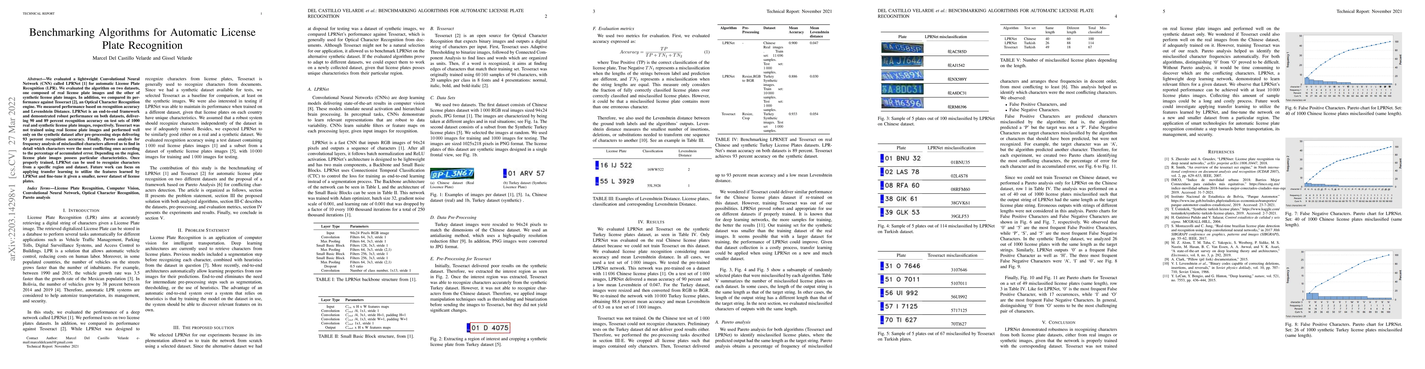 This paper benchmarks LPRNet, a lightweight Convolutional Neural Network, for automatic License Plate Recognition (LPR) against Tesseract, an Optical Character Recognition engine. LPRNet demonstrated robust performance with 90% accuracy on real images and 89% on synthetic ones, while Tesseract performed well on synthetic images post-processing but struggled with real ones. The study also identified frequent misclassified characters through Pareto analysis.