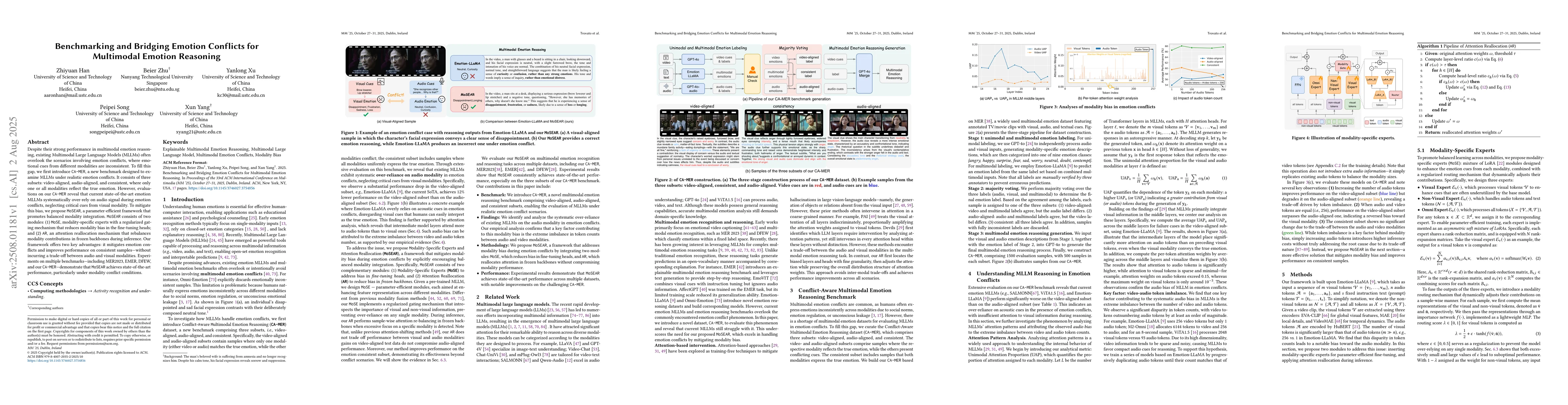 Despite their strong performance in multimodal emotion reasoning, existing Multimodal Large Language Models (MLLMs) often overlook the scenarios involving emotion conflicts, where emotional cues from different modalities are inconsistent. To fill this gap, we first introduce CA-MER, a new benchmark designed to examine MLLMs under realistic emotion conflicts. It consists of three subsets: video-aligned, audio-aligned, and consistent, where only one or all modalities reflect the true emotion. However, evaluations on our CA-MER reveal that current state-of-the-art emotion MLLMs systematically over-rely on audio signal during emotion conflicts, neglecting critical cues from visual modality. To mitigate this bias, we propose MoSEAR, a parameter-efficient framework that promotes balanced modality integration. MoSEAR consists of two modules: (1)MoSE, modality-specific experts with a regularized gating mechanism that reduces modality bias in the fine-tuning heads; and (2)AR, an attention reallocation mechanism that rebalances modality contributions in frozen backbones during inference. Our framework offers two key advantages: it mitigates emotion conflicts and improves performance on consistent samples-without incurring a trade-off between audio and visual modalities. Experiments on multiple benchmarks-including MER2023, EMER, DFEW, and our CA-MER-demonstrate that MoSEAR achieves state-of-the-art performance, particularly under modality conflict conditions.