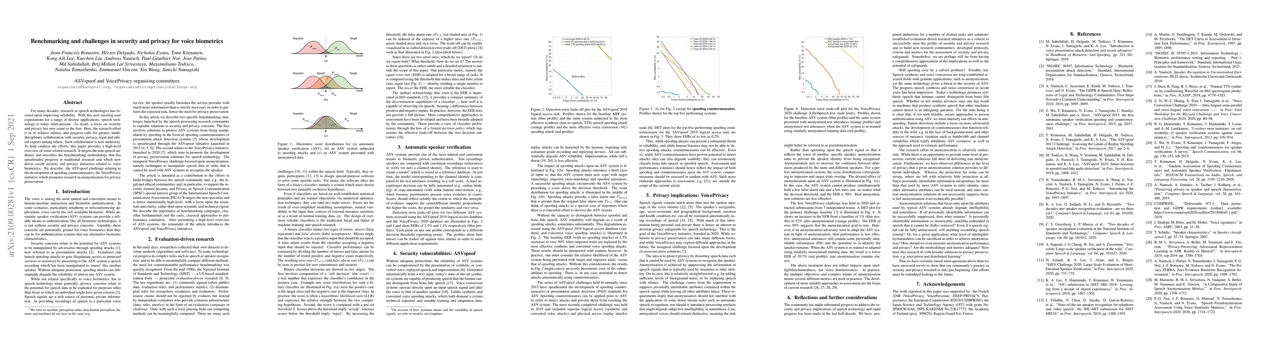 This paper offers a high-level overview of security and privacy challenges in voice biometrics, emphasizing the need for multidisciplinary collaboration. It highlights benchmarking initiatives like the ASVspoof challenge for spoofing countermeasures and the VoicePrivacy initiative for privacy preservation.