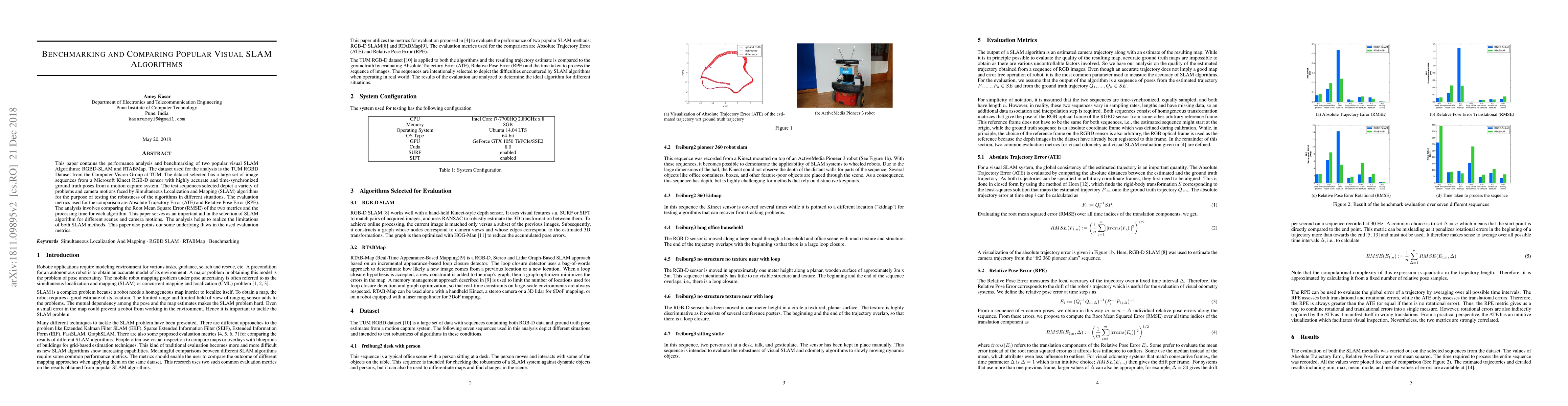 This paper benchmarks and compares RGBD-SLAM and RTABMap using the TUM RGBD Dataset, evaluating them on ATE, RPE, and processing time to aid in selecting appropriate SLAM algorithms for various scenarios. It also highlights limitations of both methods and evaluation metrics.