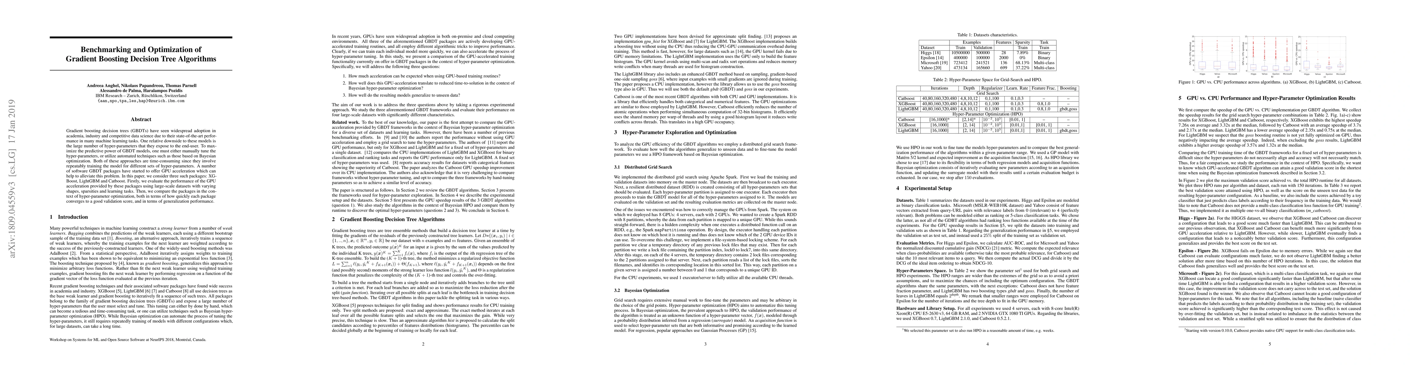 This paper benchmarks and optimizes gradient boosting decision tree algorithms, evaluating GPU acceleration in XGBoost, LightGBM, and Catboost on large-scale datasets. It compares these packages based on convergence speed and generalization performance during hyper-parameter optimization.