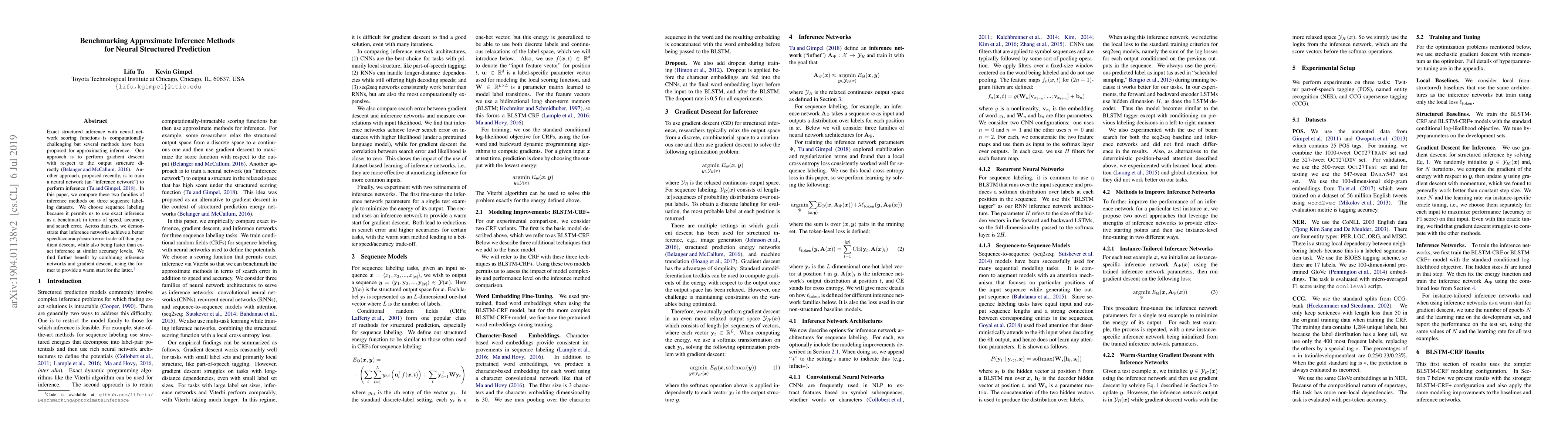 This paper benchmarks two approximate inference methods for neural structured prediction on sequence labeling datasets, finding that inference networks outperform gradient descent in speed/accuracy trade-offs and benefit from combining with gradient descent to provide a warm start for faster convergence.