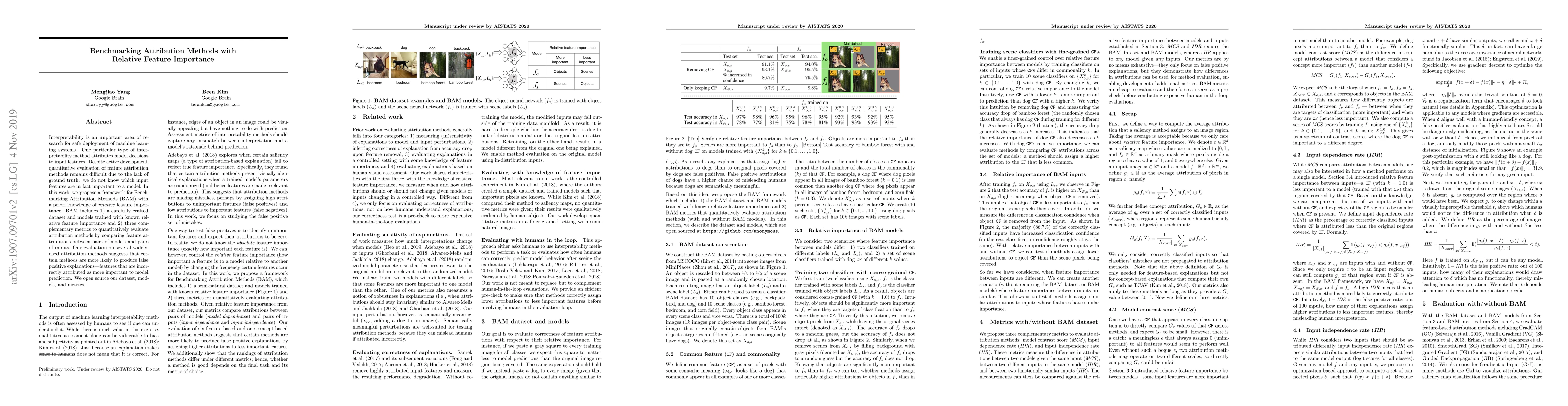 This paper proposes a framework for benchmarking feature attribution methods using known relative feature importance, including a dataset and models with a priori knowledge, and three metrics to evaluate how well these methods attribute importance correctly. The study finds that some methods are prone to false positives, attributing incorrect features as important.