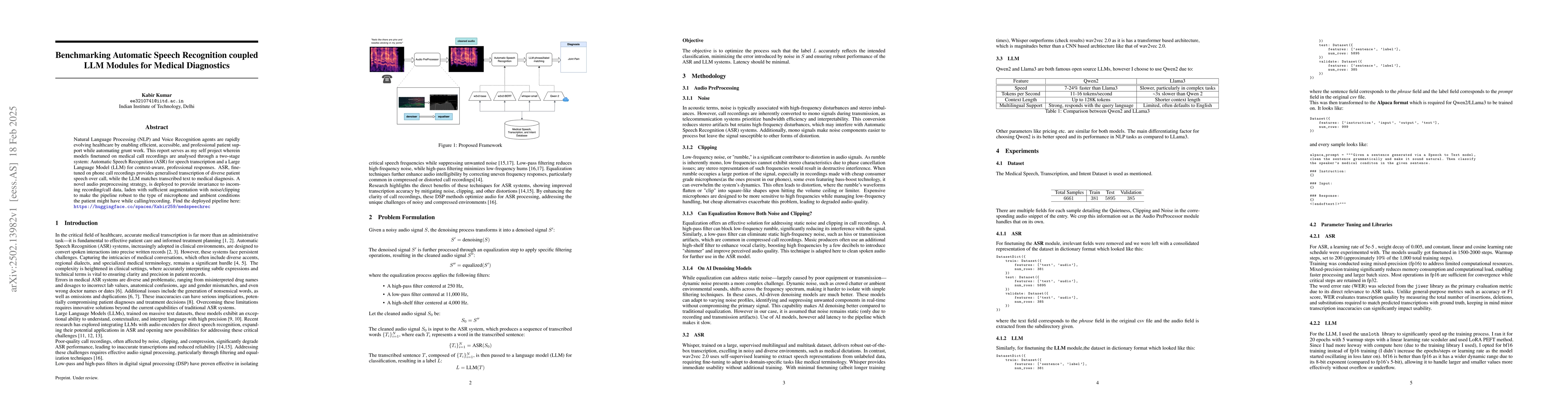 This study benchmarks an ASR-LLM system for medical diagnostics, fine-tuning ASR on medical call recordings for accurate speech transcription and using an LLM to match transcriptions to diagnoses. An innovative audio preprocessing strategy enhances robustness against varying recording conditions.