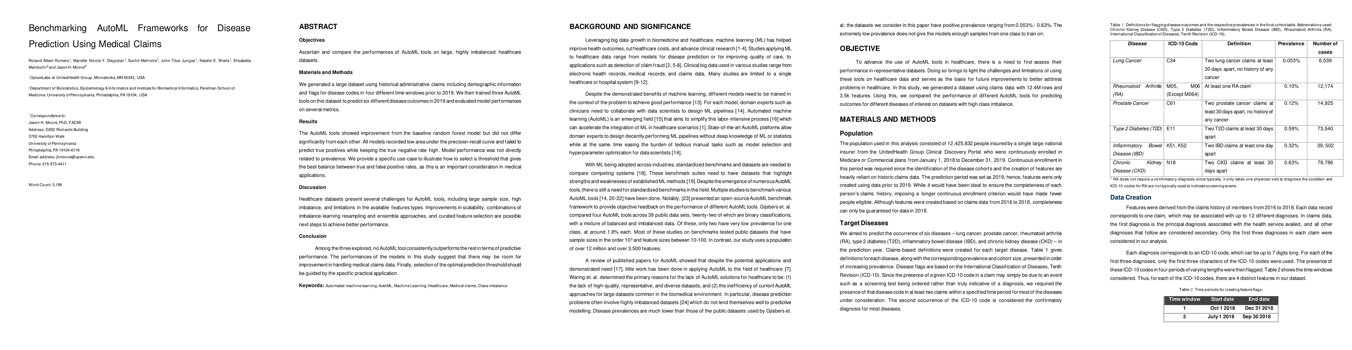 This study benchmarks the performance of three AutoML frameworks on large, imbalanced medical claims datasets for disease prediction, finding no significant differences among them. Despite improvements over baseline models, the AutoML tools struggled with precision-recall balance and feature selection challenges, highlighting the need for further enhancements in handling such complex healthcare data.
