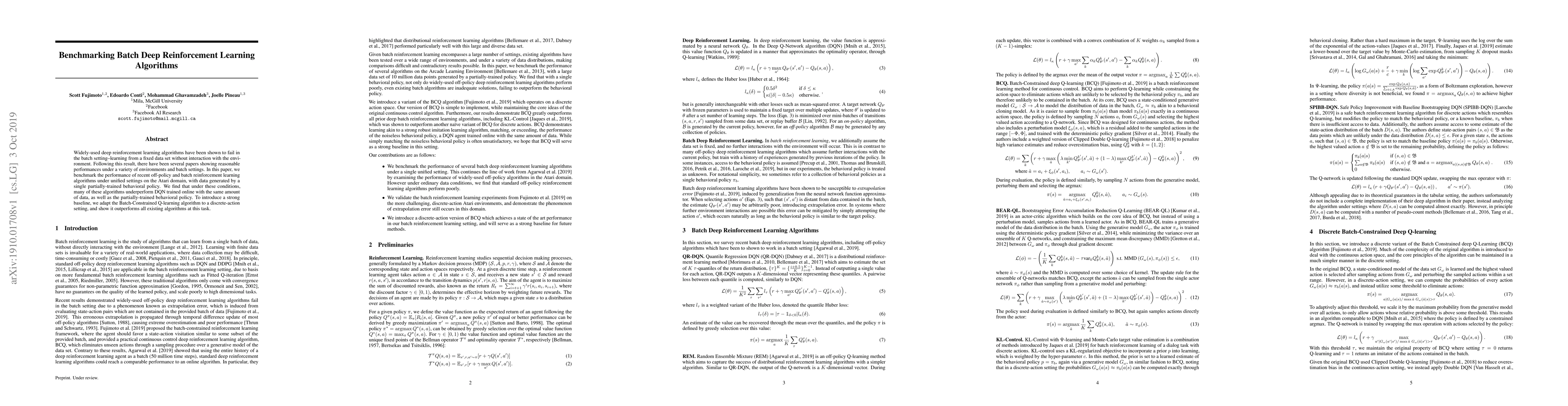 This paper benchmarks the performance of recent batch deep reinforcement learning algorithms on the Atari domain, finding that many underperform compared to online DQN and a partially-trained behavioral policy. The authors adapt Batch-Constrained Q-learning to a discrete-action setting, demonstrating superior performance over existing algorithms.
