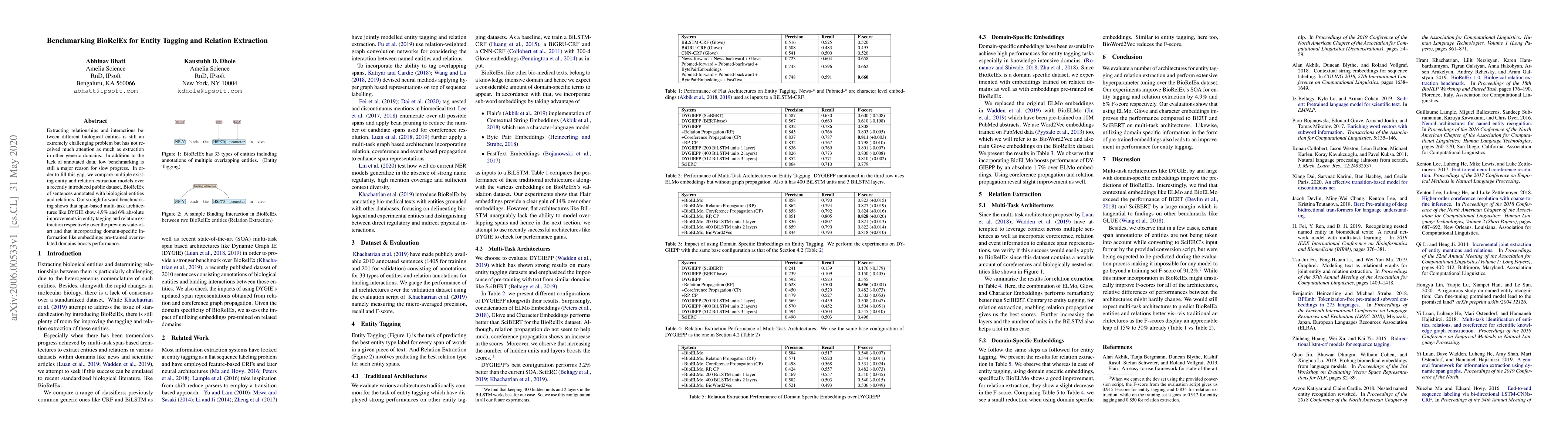 The paper presents a comprehensive benchmarking of existing entity and relation extraction models on the BioRelEx dataset, highlighting the effectiveness of multi-task architectures and domain-specific embeddings.