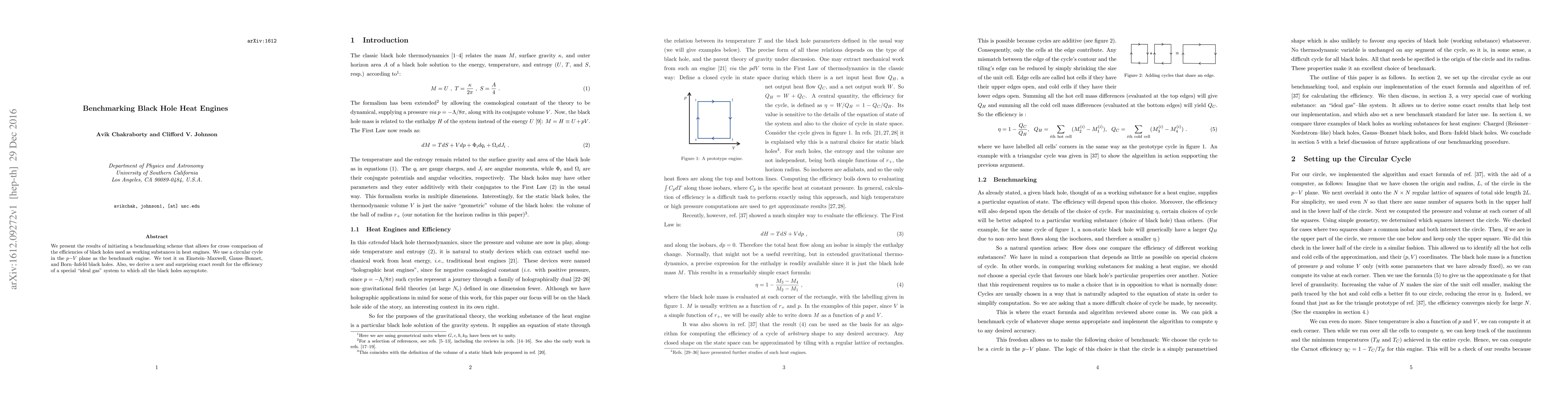 We present the results of initiating a benchmarking scheme that allows for cross-comparison of the efficiencies of black holes used as working substances in heat engines. We use a circular cycle in the p-V plane as the benchmark engine. We test it on Einstein-Maxwell, Gauss-Bonnet, and Born-Infeld black holes. Also, we derive a new and surprising exact result for the efficiency of a special `ideal gas' system to which all the black holes asymptote.