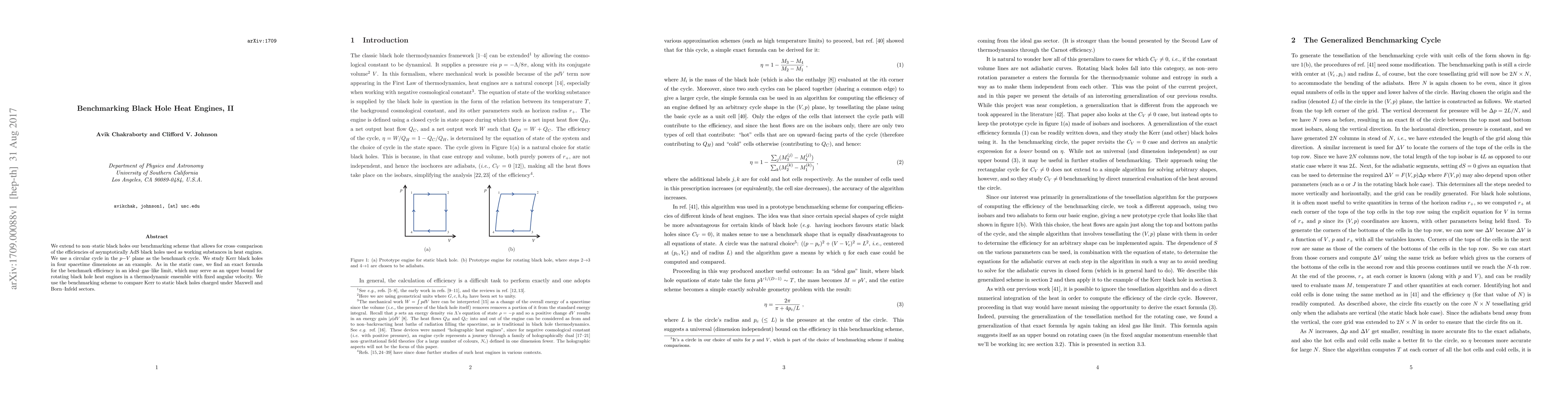 We extend to non-static black holes our benchmarking scheme that allows for cross-comparison of the efficiencies of asymptotically AdS black holes used as working substances in heat engines. We use a circular cycle in the p-V plane as the benchmark cycle. We study Kerr black holes in four spacetime dimensions as an example. As in the static case, we find an exact formula for the benchmark efficiency in an ideal-gas-like limit, which may serve as an upper bound for rotating black hole heat engines in a thermodynamic ensemble with fixed angular velocity. We use the benchmarking scheme to compare Kerr to static black holes charged under Maxwell and Born-Infeld sectors.