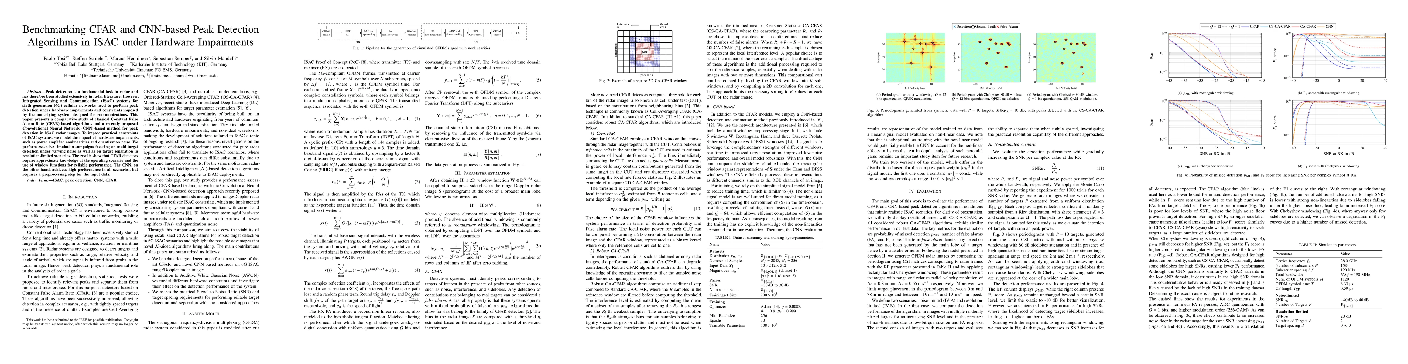 The paper presents a comparative analysis of CFAR and CNN-based peak detection algorithms under hardware impairments in ISAC systems.