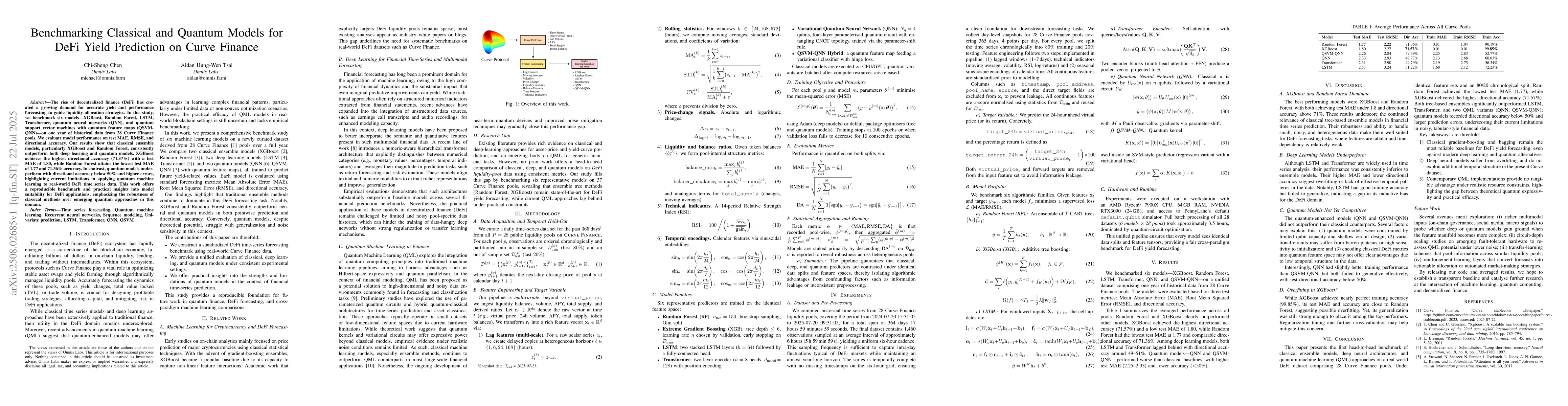 The rise of decentralized finance (DeFi) has created a growing demand for accurate yield and performance forecasting to guide liquidity allocation strategies. In this study, we benchmark six models, XGBoost, Random Forest, LSTM, Transformer, quantum neural networks (QNN), and quantum support vector machines with quantum feature maps (QSVM-QNN), on one year of historical data from 28 Curve Finance pools. We evaluate model performance on test MAE, RMSE, and directional accuracy. Our results show that classical ensemble models, particularly XGBoost and Random Forest, consistently outperform both deep learning and quantum models. XGBoost achieves the highest directional accuracy (71.57%) with a test MAE of 1.80, while Random Forest attains the lowest test MAE of 1.77 and 71.36% accuracy. In contrast, quantum models underperform with directional accuracy below 50% and higher errors, highlighting current limitations in applying quantum machine learning to real-world DeFi time series data. This work offers a reproducible benchmark and practical insights into model suitability for DeFi applications, emphasizing the robustness of classical methods over emerging quantum approaches in this domain.