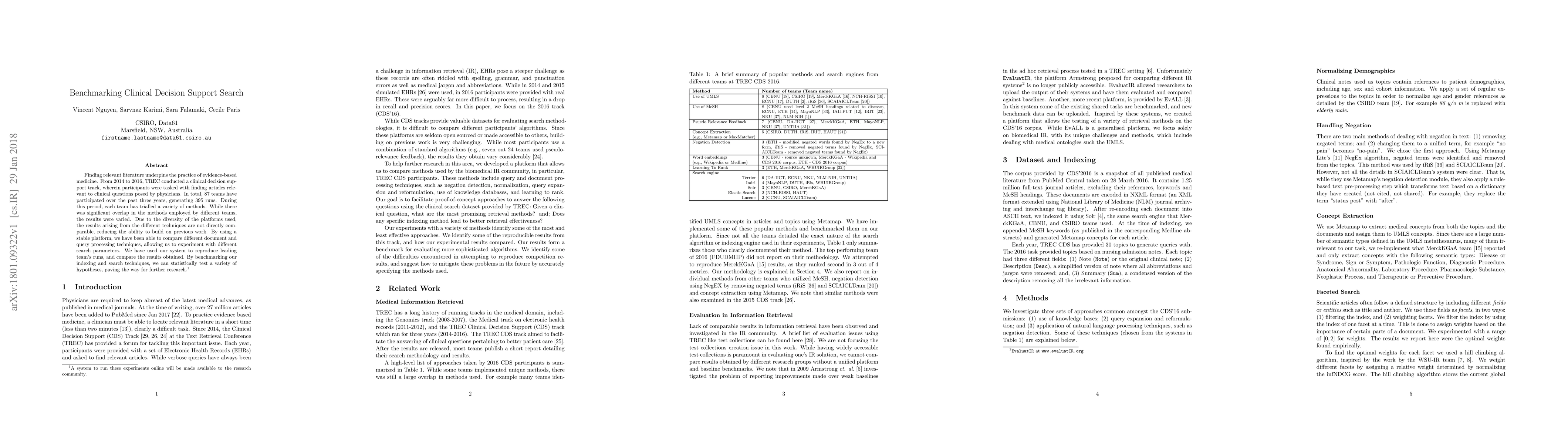 Finding relevant literature underpins the practice of evidence-based medicine. From 2014 to 2016, TREC conducted a clinical decision support track, wherein participants were tasked with finding articles relevant to clinical questions posed by physicians. In total, 87 teams have participated over the past three years, generating 395 runs. During this period, each team has trialled a variety of methods. While there was significant overlap in the methods employed by different teams, the results were varied. Due to the diversity of the platforms used, the results arising from the different techniques are not directly comparable, reducing the ability to build on previous work. By using a stable platform, we have been able to compare different document and query processing techniques, allowing us to experiment with different search parameters. We have used our system to reproduce leading teams runs, and compare the results obtained. By benchmarking our indexing and search techniques, we can statistically test a variety of hypotheses, paving the way for further research.