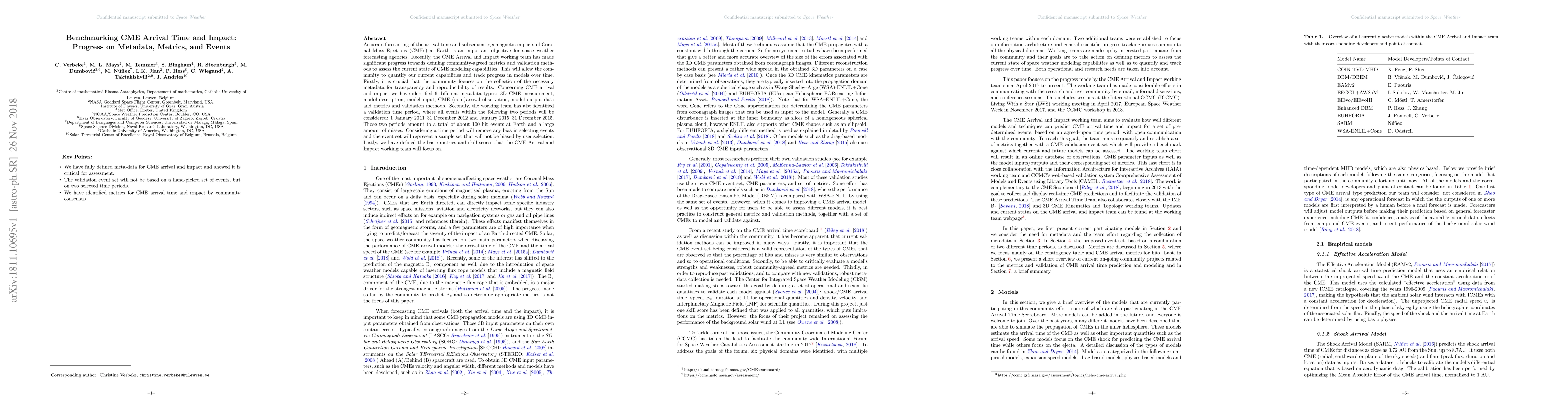 Accurate forecasting of the arrival time and subsequent geomagnetic impacts of Coronal Mass Ejections (CMEs) at Earth is an important objective for space weather forecasting agencies. Recently, the CME Arrival and Impact working team has made significant progress towards defining community-agreed metrics and validation methods to assess the current state of CME modeling capabilities. This will allow the community to quantify our current capabilities and track progress in models over time. Firstly, it is crucial that the community focuses on the collection of the necessary metadata for transparency and reproducibility of results. Concerning CME arrival and impact we have identified 6 different metadata types: 3D CME measurement, model description, model input, CME (non-)arrival observation, model output data and metrics and validation methods. Secondly, the working team has also identified a validation time period, where all events within the following two periods will be considered: 1 January 2011-31 December 2012 and January 2015-31 December 2015. Those two periods amount to a total of about 100 hit events at Earth and a large amount of misses. Considering a time period will remove any bias in selecting events and the event set will represent a sample set that will not be biased by user selection. Lastly, we have defined the basic metrics and skill scores that the CME Arrival and Impact working team will focus on.