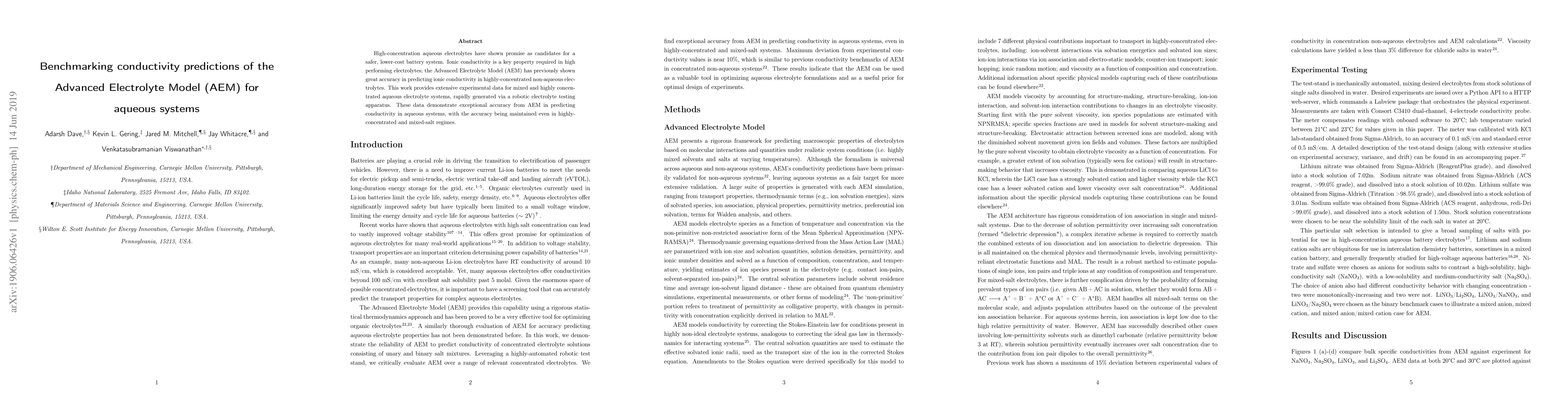 This study benchmarks the Advanced Electrolyte Model (AEM) for predicting ionic conductivity in high-concentration aqueous electrolytes, showing exceptional accuracy even in mixed and highly concentrated solutions, validated through extensive experimental data generated by a robotic testing apparatus.