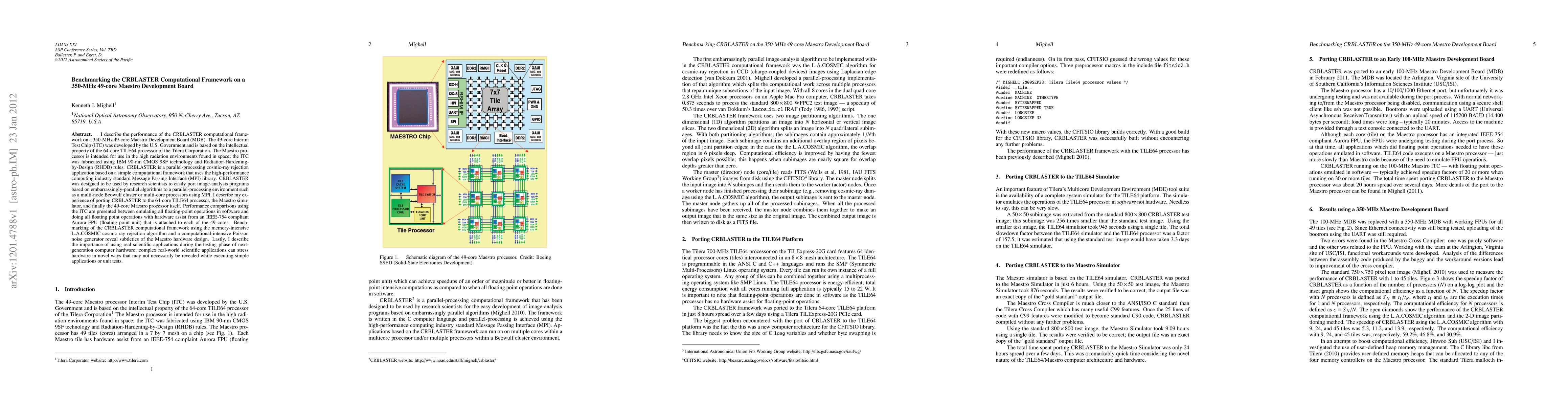 This paper benchmarks the CRBLASTER framework on a 49-core Maestro processor, revealing performance differences between software emulation and hardware acceleration in floating-point operations. Real-world scientific applications like L.A.COSMIC cosmic ray rejection demonstrate the importance of testing next-generation computer hardware with complex, memory-intensive tasks.
