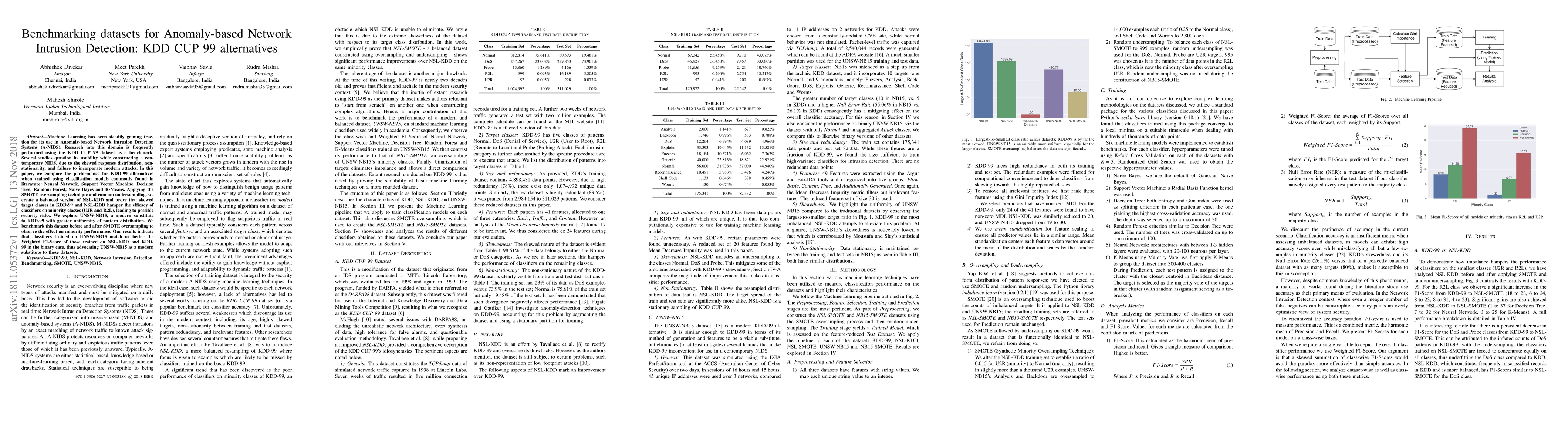 Machine Learning has been steadily gaining traction for its use in Anomaly-based Network Intrusion Detection Systems (A-NIDS). Research into this domain is frequently performed using the KDD~CUP~99 dataset as a benchmark. Several studies question its usability while constructing a contemporary NIDS, due to the skewed response distribution, non-stationarity, and failure to incorporate modern attacks. In this paper, we compare the performance for KDD-99 alternatives when trained using classification models commonly found in literature: Neural Network, Support Vector Machine, Decision Tree, Random Forest, Naive Bayes and K-Means. Applying the SMOTE oversampling technique and random undersampling, we create a balanced version of NSL-KDD and prove that skewed target classes in KDD-99 and NSL-KDD hamper the efficacy of classifiers on minority classes (U2R and R2L), leading to possible security risks. We explore UNSW-NB15, a modern substitute to KDD-99 with greater uniformity of pattern distribution. We benchmark this dataset before and after SMOTE oversampling to observe the effect on minority performance. Our results indicate that classifiers trained on UNSW-NB15 match or better the Weighted F1-Score of those trained on NSL-KDD and KDD-99 in the binary case, thus advocating UNSW-NB15 as a modern substitute to these datasets.