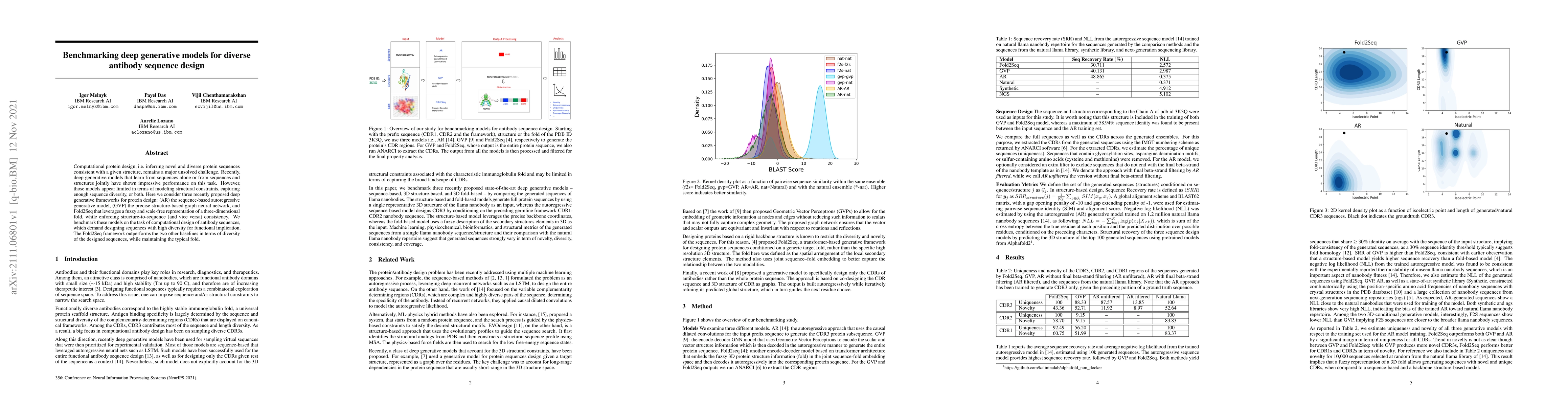 This paper benchmarks three deep generative models for designing diverse antibody sequences, focusing on sequence diversity and structural consistency. The Fold2Seq model, which uses a fuzzy representation of protein folds, outperforms the others in generating diverse sequences while maintaining structural integrity.