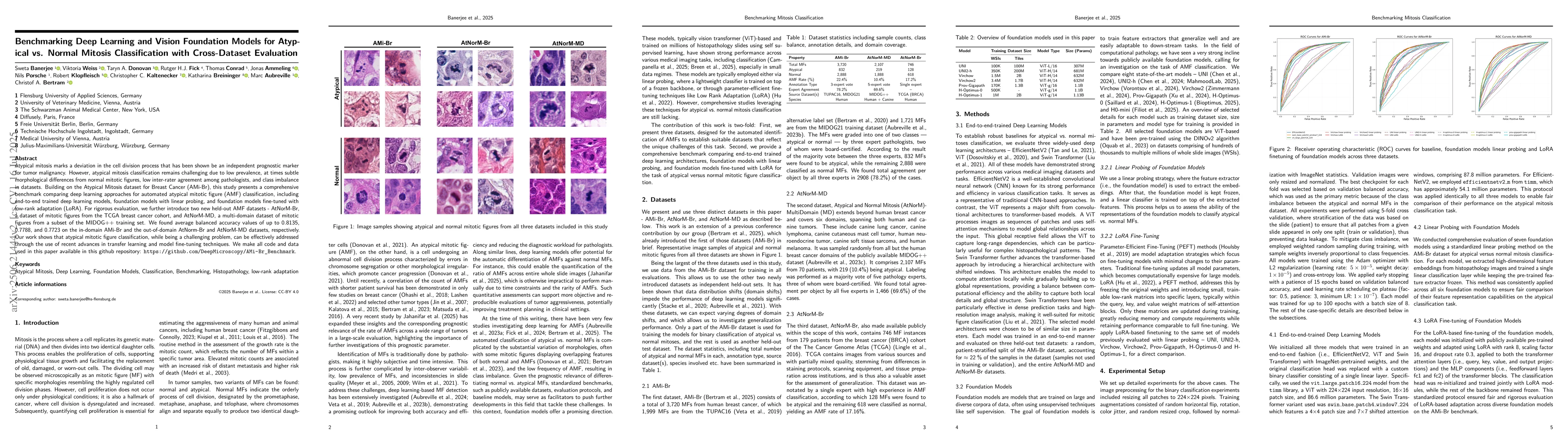 This research benchmarks deep learning methods for classifying atypical (abnormal) versus normal cell divisions (mitoses) in breast cancer, using datasets AMi-Br, AtNorM-Br, and AtNorM-MD. It finds that fine-tuning foundation models with low-rank adaptation (LoRA) yields high accuracy (up to 0.8135) for this challenging task, even across different datasets, indicating effective use of transfer learning techniques for medical image analysis.