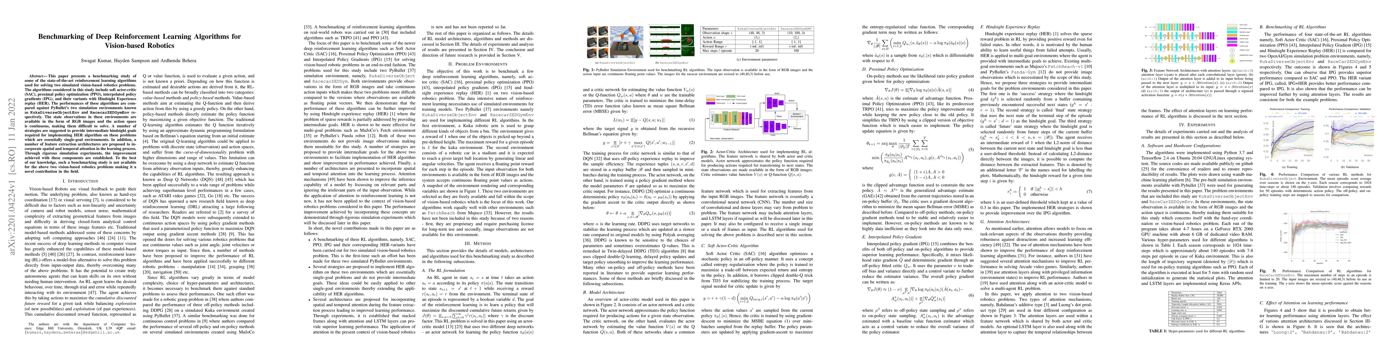This study benchmarks state-of-the-art reinforcement learning algorithms (SAC, PPO, IPG, and HER) on two simulated vision-based robotics problems (KukaDiverseObjectEnv and RacecarZEDGymEnv) using PyBullet's simulation environments. The algorithms' performances are compared with strategies for hindsight goal selection and feature extraction architectures incorporating spatial and temporal attention.