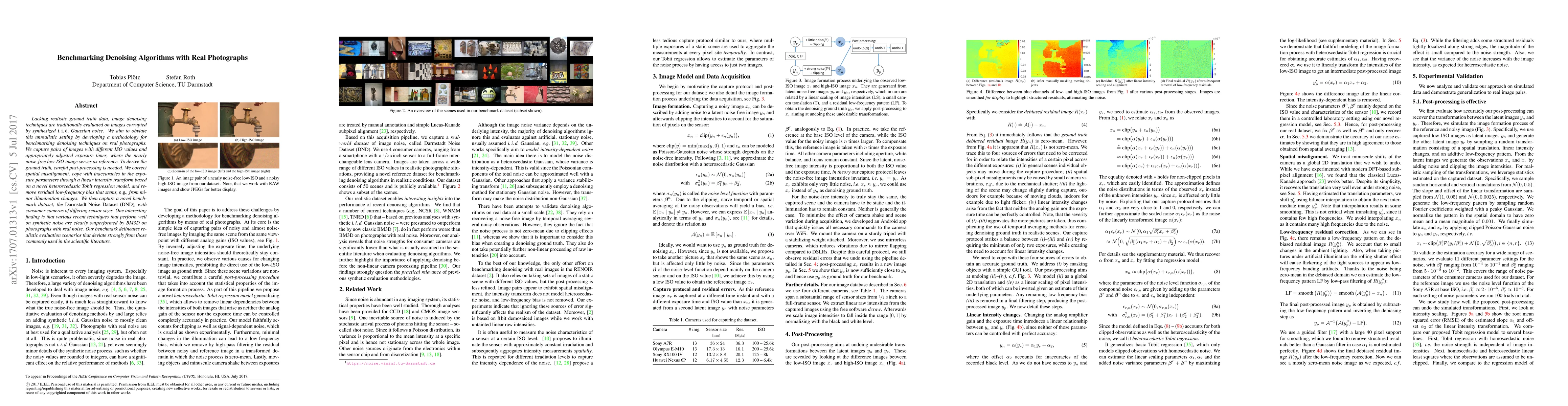 This paper develops a novel methodology for benchmarking image denoising techniques using real photographs, capturing pairs of images with different ISO values to create a ground truth. The Darmstadt Noise Dataset (DND) reveals that recent techniques often perform poorly on real-world noise compared to BM3D.
