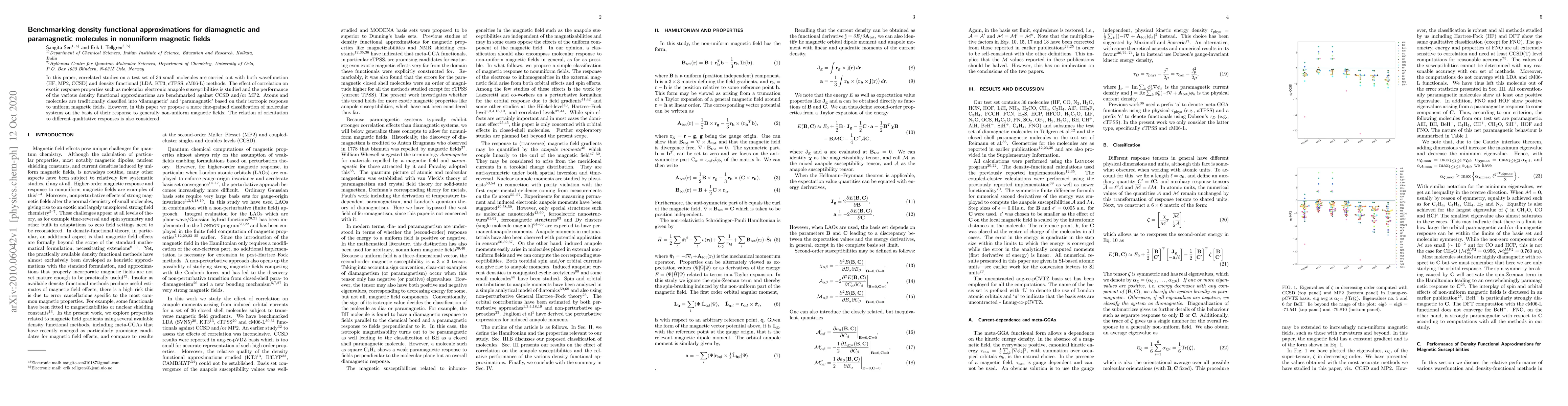 This paper benchmarks various density functional approximations against wavefunction methods for 36 small molecules in nonuniform magnetic fields, exploring their response properties and proposing a refined classification based on these responses. The study evaluates the performance of LDA, KT3, cTPSS, and cM06-L against CCSD and MP2 for diamagnetic and paramagnetic classifications.