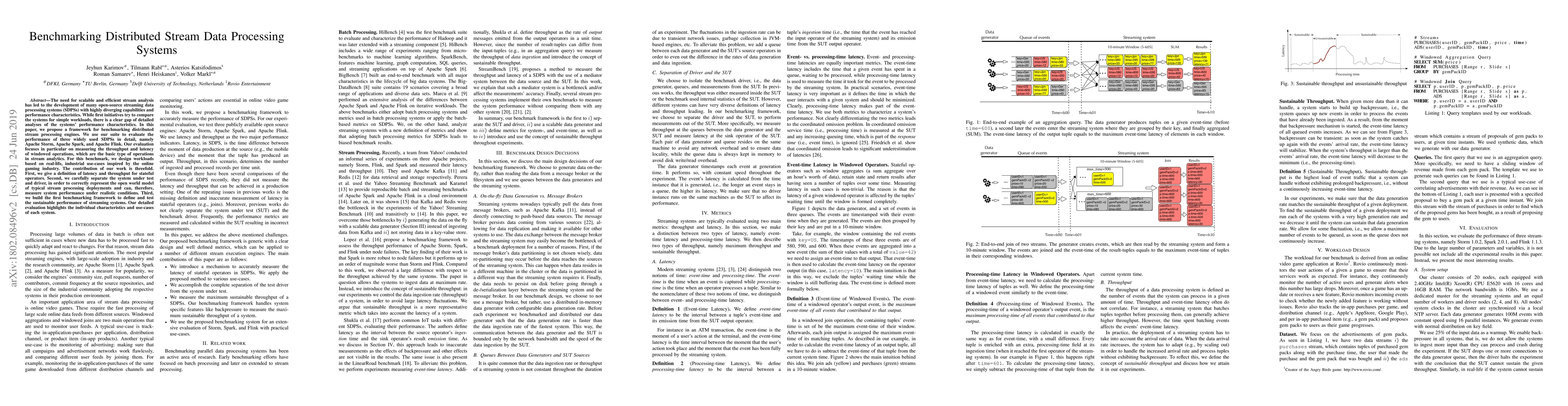 This paper proposes a benchmarking framework for distributed stream data processing systems, evaluating Apache Storm, Spark, and Flink based on throughput and latency of windowed operations. The study highlights each system's unique performance characteristics and operational use-cases through realistic, real-life inspired workloads.