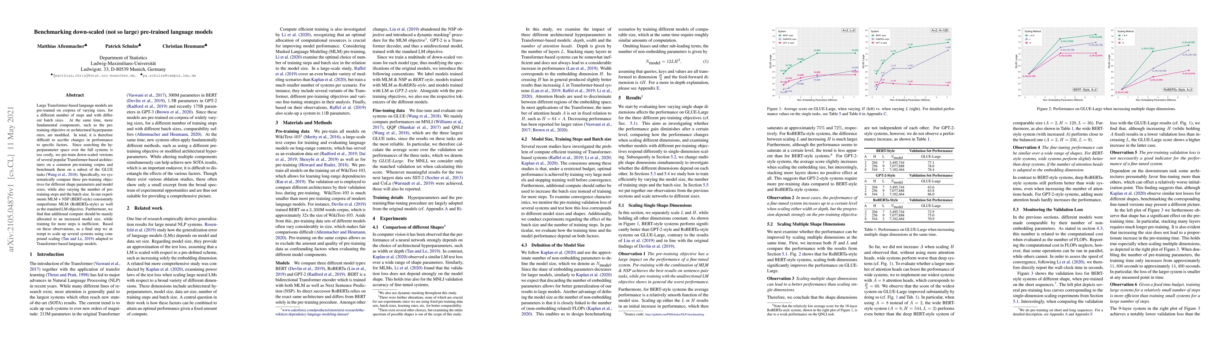 Large Transformer-based language models are pre-trained on corpora of varying sizes, for a different number of steps and with different batch sizes. At the same time, more fundamental components, such as the pre-training objective or architectural hyperparameters, are modified. In total, it is therefore difficult to ascribe changes in performance to specific factors. Since searching the hyperparameter space over the full systems is too costly, we pre-train down-scaled versions of several popular Transformer-based architectures on a common pre-training corpus and benchmark them on a subset of the GLUE tasks (Wang et al., 2018). Specifically, we systematically compare three pre-training objectives for different shape parameters and model sizes, while also varying the number of pre-training steps and the batch size. In our experiments MLM + NSP (BERT-style) consistently outperforms MLM (RoBERTa-style) as well as the standard LM objective. Furthermore, we find that additional compute should be mainly allocated to an increased model size, while training for more steps is inefficient. Based on these observations, as a final step we attempt to scale up several systems using compound scaling (Tan and Le, 2019) adapted to Transformer-based language models.