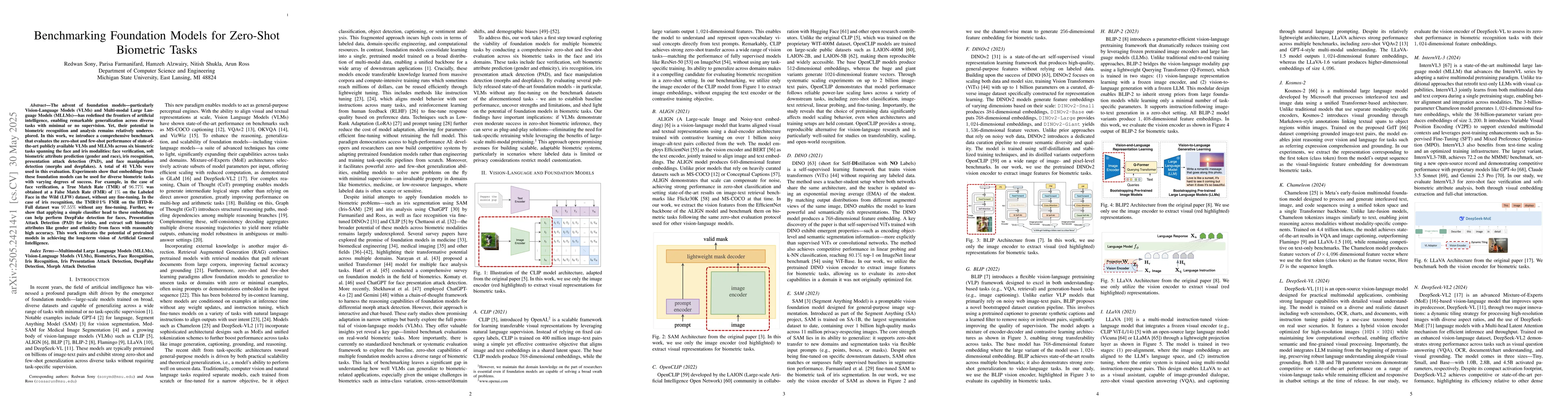 The advent of foundation models, particularly Vision-Language Models (VLMs) and Multi-modal Large Language Models (MLLMs), has redefined the frontiers of artificial intelligence, enabling remarkable generalization across diverse tasks with minimal or no supervision. Yet, their potential in biometric recognition and analysis remains relatively underexplored. In this work, we introduce a comprehensive benchmark that evaluates the zero-shot and few-shot performance of state-of-the-art publicly available VLMs and MLLMs across six biometric tasks spanning the face and iris modalities: face verification, soft biometric attribute prediction (gender and race), iris recognition, presentation attack detection (PAD), and face manipulation detection (morphs and deepfakes). A total of 41 VLMs were used in this evaluation. Experiments show that embeddings from these foundation models can be used for diverse biometric tasks with varying degrees of success. For example, in the case of face verification, a True Match Rate (TMR) of 96.77 percent was obtained at a False Match Rate (FMR) of 1 percent on the Labeled Face in the Wild (LFW) dataset, without any fine-tuning. In the case of iris recognition, the TMR at 1 percent FMR on the IITD-R-Full dataset was 97.55 percent without any fine-tuning. Further, we show that applying a simple classifier head to these embeddings can help perform DeepFake detection for faces, Presentation Attack Detection (PAD) for irides, and extract soft biometric attributes like gender and ethnicity from faces with reasonably high accuracy. This work reiterates the potential of pretrained models in achieving the long-term vision of Artificial General Intelligence.