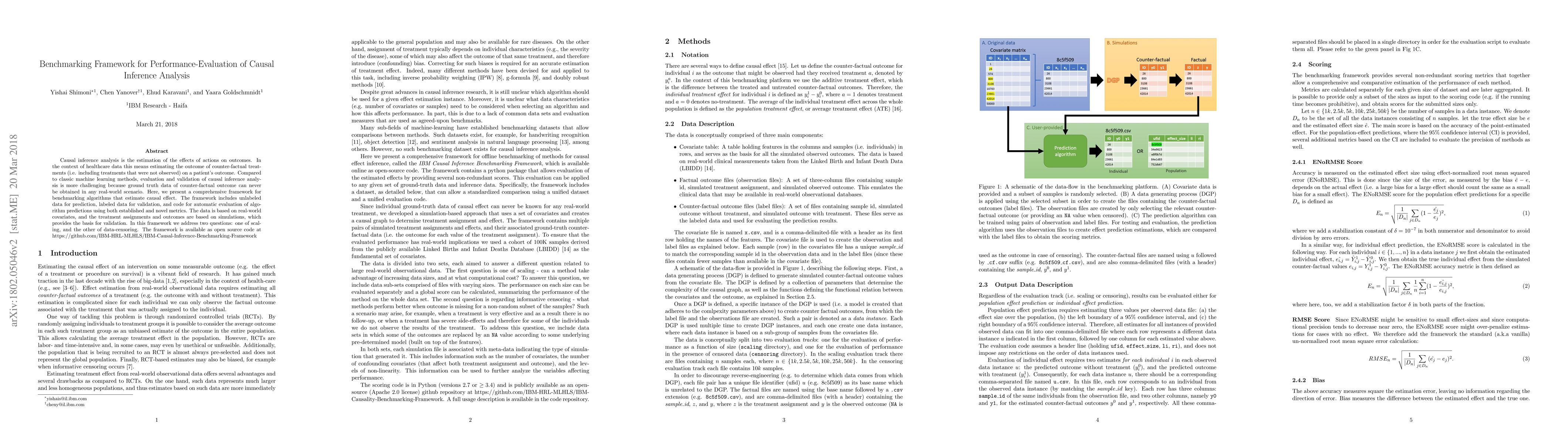 Causal inference analysis is the estimation of the effects of actions on outcomes. In the context of healthcare data this means estimating the outcome of counter-factual treatments (i.e. including treatments that were not observed) on a patient's outcome. Compared to classic machine learning methods, evaluation and validation of causal inference analysis is more challenging because ground truth data of counter-factual outcome can never be obtained in any real-world scenario. Here, we present a comprehensive framework for benchmarking algorithms that estimate causal effect. The framework includes unlabeled data for prediction, labeled data for validation, and code for automatic evaluation of algorithm predictions using both established and novel metrics. The data is based on real-world covariates, and the treatment assignments and outcomes are based on simulations, which provides the basis for validation. In this framework we address two questions: one of scaling, and the other of data-censoring. The framework is available as open source code at https://github.com/IBM-HRL-MLHLS/IBM-Causal-Inference-Benchmarking-Framework