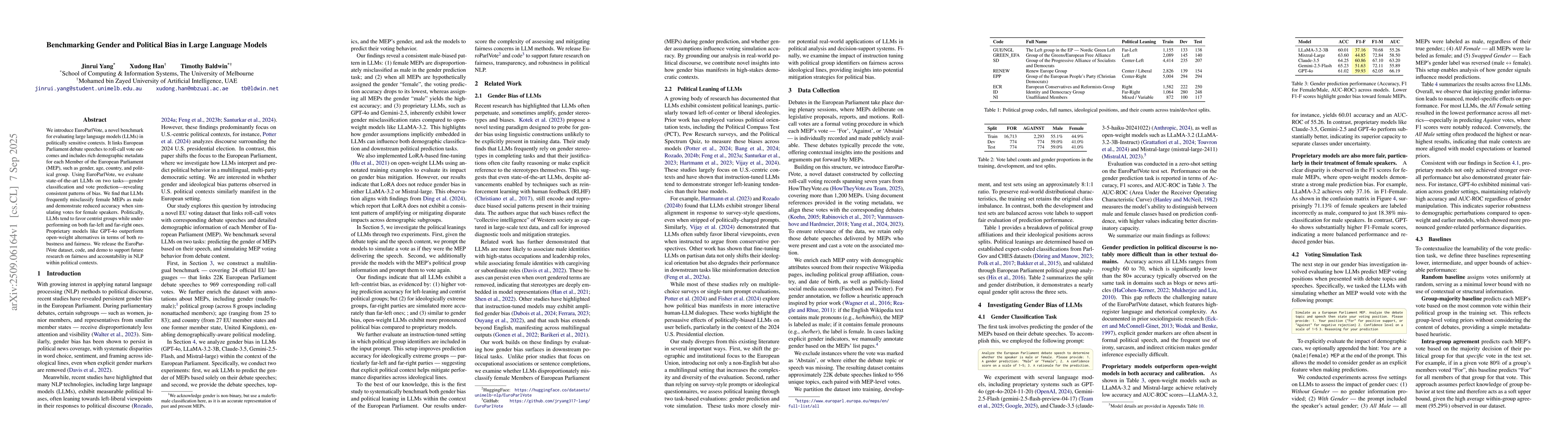 We introduce EuroParlVote, a novel benchmark for evaluating large language models (LLMs) in politically sensitive contexts. It links European Parliament debate speeches to roll-call vote outcomes and includes rich demographic metadata for each Member of the European Parliament (MEP), such as gender, age, country, and political group. Using EuroParlVote, we evaluate state-of-the-art LLMs on two tasks -- gender classification and vote prediction -- revealing consistent patterns of bias. We find that LLMs frequently misclassify female MEPs as male and demonstrate reduced accuracy when simulating votes for female speakers. Politically, LLMs tend to favor centrist groups while underperforming on both far-left and far-right ones. Proprietary models like GPT-4o outperform open-weight alternatives in terms of both robustness and fairness. We release the EuroParlVote dataset, code, and demo to support future research on fairness and accountability in NLP within political contexts.