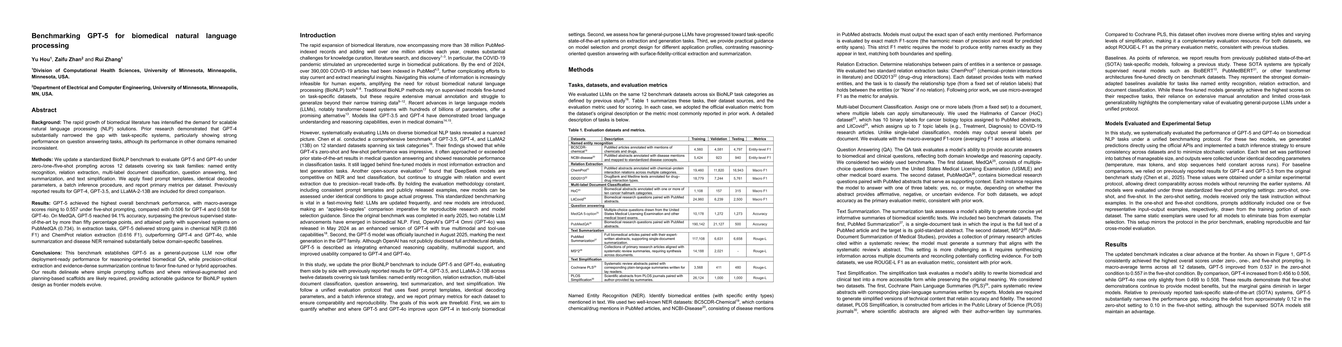 The rapid expansion of biomedical literature has heightened the need for scalable natural language processing (NLP) solutions. While GPT-4 substantially narrowed the gap with task-specific systems, especially in question answering, its performance across other domains remained uneven. We updated a standardized BioNLP benchmark to evaluate GPT-5 and GPT-4o under zero-, one-, and five-shot prompting across 12 datasets spanning six task families: named entity recognition, relation extraction, multi-label document classification, question answering, text summarization, and text simplification. Using fixed prompt templates, identical decoding parameters, and batch inference, we report primary metrics per dataset and include prior results for GPT-4, GPT-3.5, and LLaMA-2-13B for comparison. GPT-5 achieved the strongest overall benchmark performance, with macro-average scores rising to 0.557 under five-shot prompting versus 0.506 for GPT-4 and 0.508 for GPT-4o. On MedQA, GPT-5 reached 94.1% accuracy, exceeding the previous supervised state of the art by over fifty points, and attained parity with supervised systems on PubMedQA (0.734). In extraction tasks, GPT-5 delivered major gains in chemical NER (0.886 F1) and ChemProt relation extraction (0.616 F1), outperforming GPT-4 and GPT-4o, though summarization and disease NER still lagged behind domain-specific baselines. These results establish GPT-5 as a general-purpose model now offering deployment-ready performance for reasoning-oriented biomedical QA, while precision-critical extraction and evidence-dense summarization continue to favor fine-tuned or hybrid approaches. The benchmark delineates where simple prompting suffices and where retrieval-augmented or planning-based scaffolds are likely required, providing actionable guidance for BioNLP system design as frontier models advance.