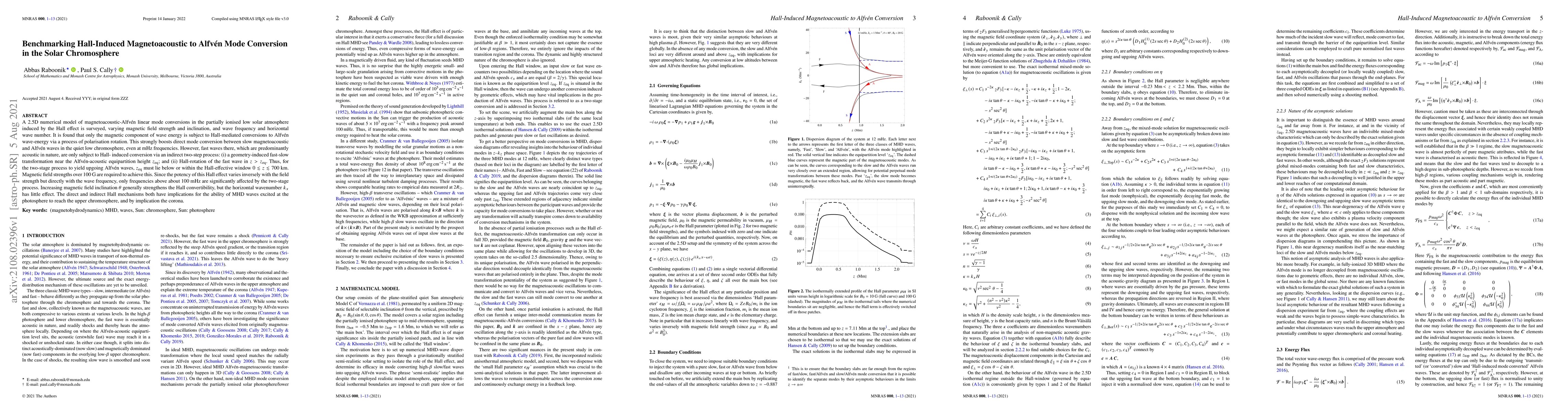 The study investigates 2.5D numerical models of magnetoacoustic-Alfvén mode conversions in the solar chromosphere, finding that the Hall effect significantly enhances direct conversion of slow magnetoacoustic waves to Alfvén waves but requires magnetic field strengths over 100 G for efficient indirect conversion of fast waves. The research highlights the influence of magnetic field strength, inclination, and wave frequency on these conversion processes.
