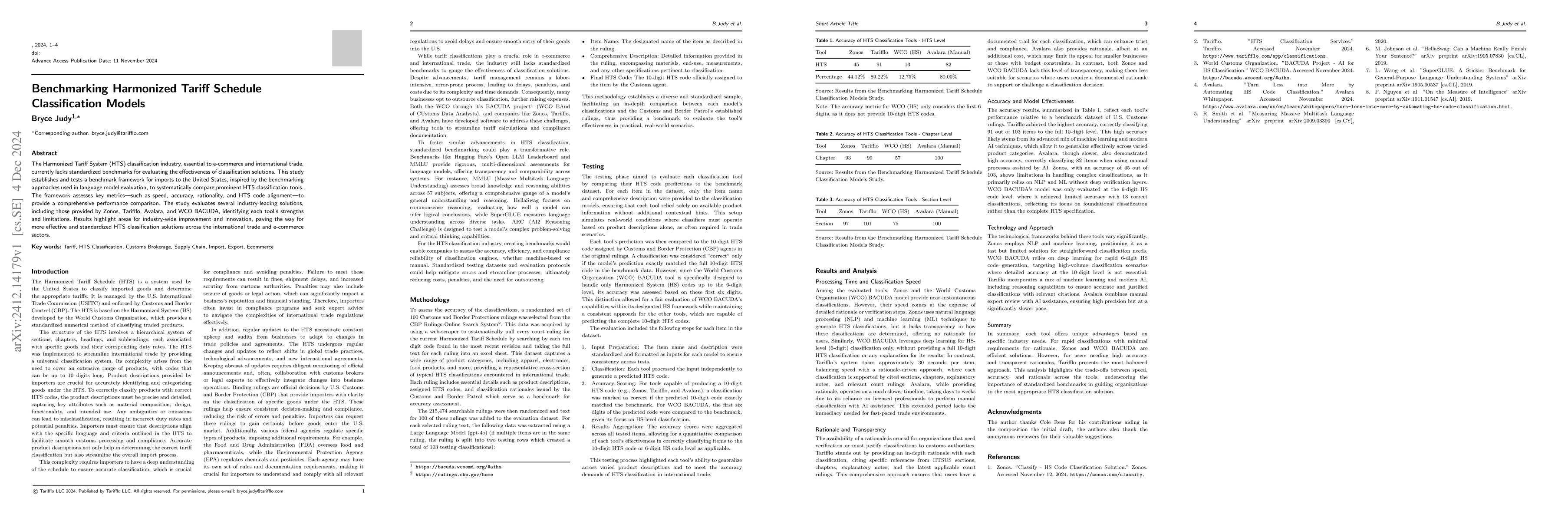 This study develops a benchmark framework to evaluate HTS classification tools, assessing speed, accuracy, and HTS code alignment for leading solutions. The results identify strengths and weaknesses, suggesting pathways for industry-wide enhancements and innovation in international trade and e-commerce.