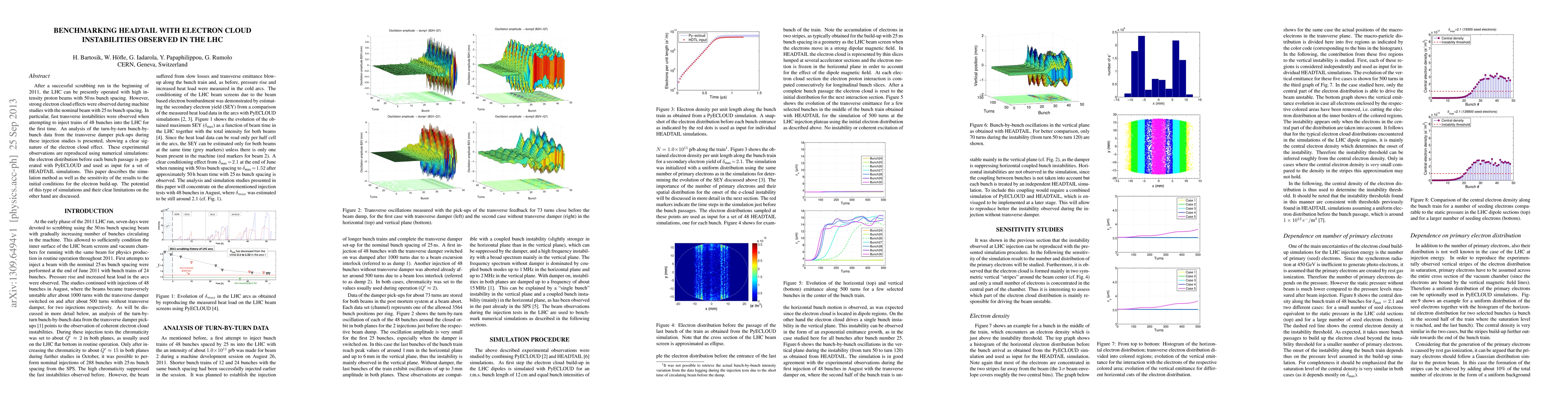 This paper benchmarks the HEADTAIL simulations against observed electron cloud instabilities in the LHC, particularly focusing on fast transverse instabilities during high-intensity proton beam operations. The study uses PyECLOUD to model electron distribution and validates the simulations with experimental data from the 2011 scrubbing run.
