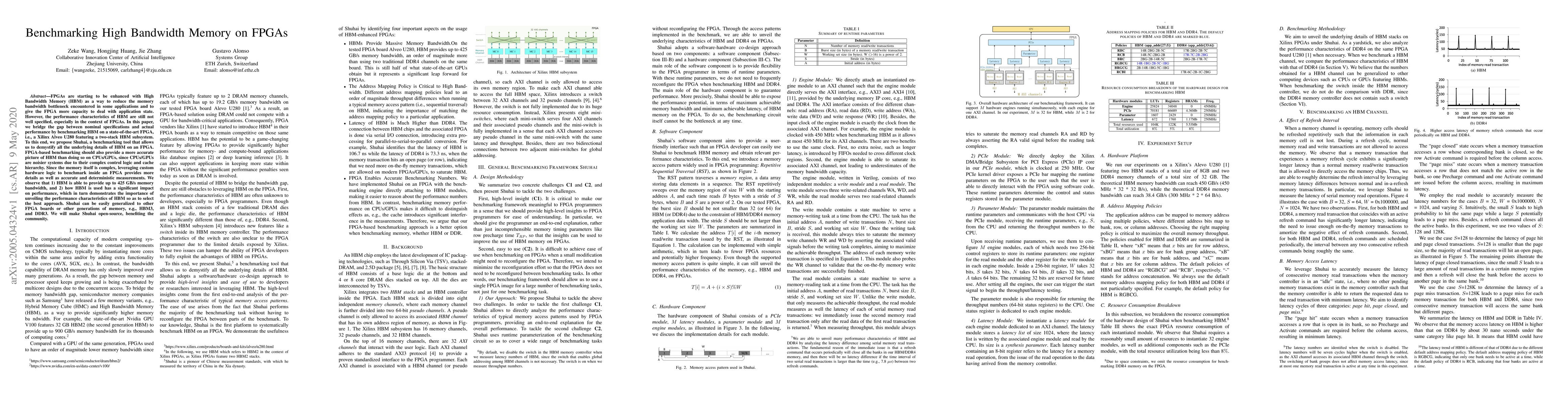 This paper benchmarks High Bandwidth Memory (HBM) on FPGAs using a tool called Shuhai to evaluate its performance characteristics. The study reveals that HBM can provide up to 425GB/s memory bandwidth and highlights the importance of understanding HBM usage for optimal performance, contrasting it with DDR4.
