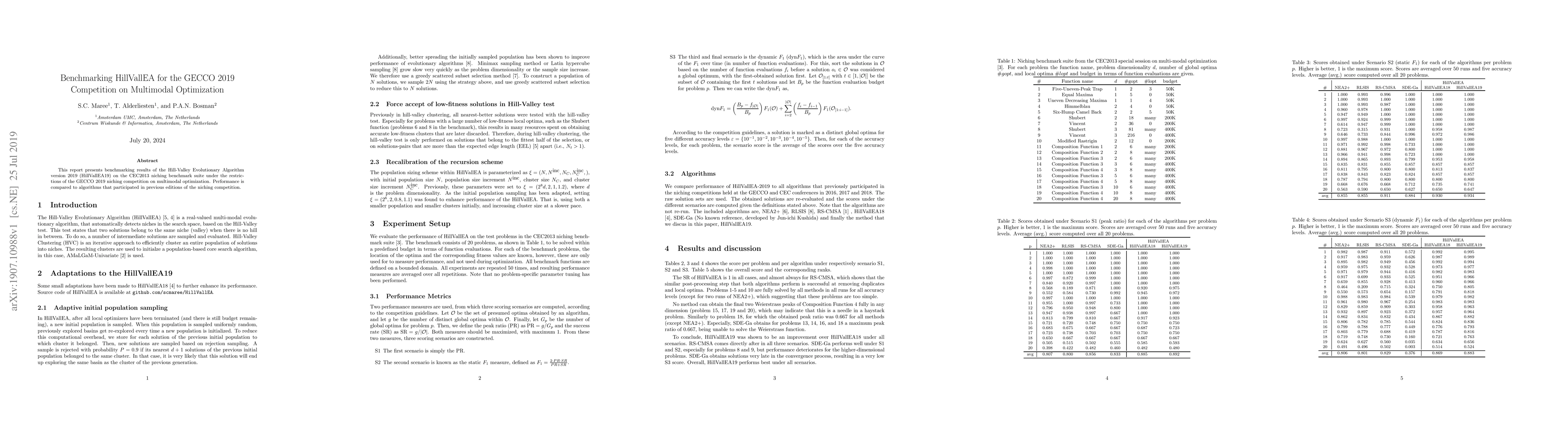 This report presents benchmarking results of the Hill-Valley Evolutionary Algorithm version 2019 (HillVallEA19) on the CEC2013 niching benchmark suite under the restrictions of the GECCO 2019 niching competition on multimodal optimization. Performance is compared to algorithms that participated in previous editions of the niching competition.