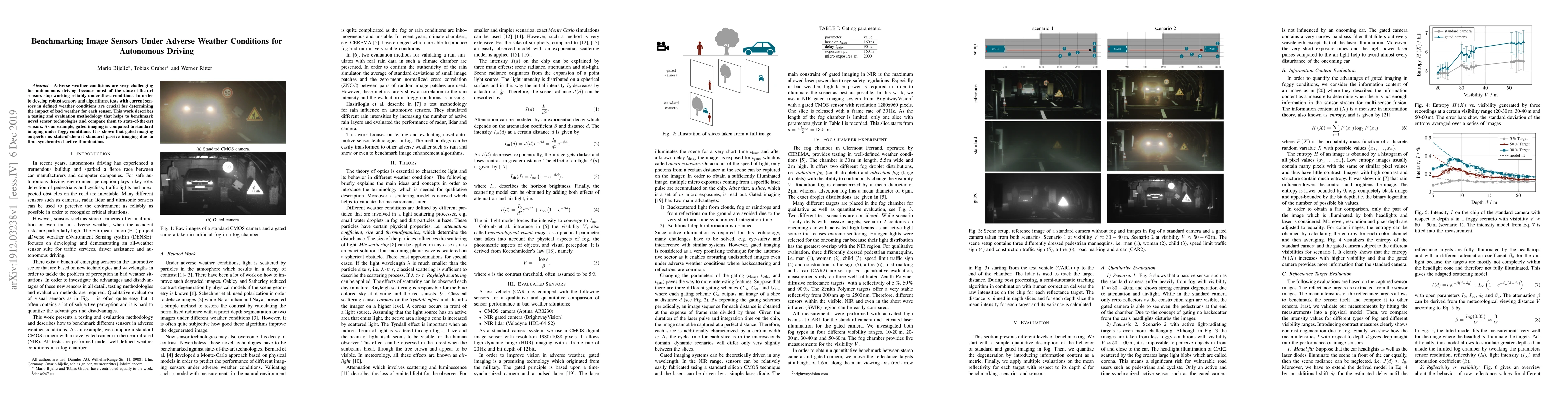This paper proposes a benchmarking methodology to evaluate image sensors' performance under adverse weather conditions for autonomous driving, highlighting that gated imaging outperforms standard passive imaging in fog due to its active illumination technique. The study aims to develop robust sensors and algorithms by comparing current technologies under defined weather scenarios.
