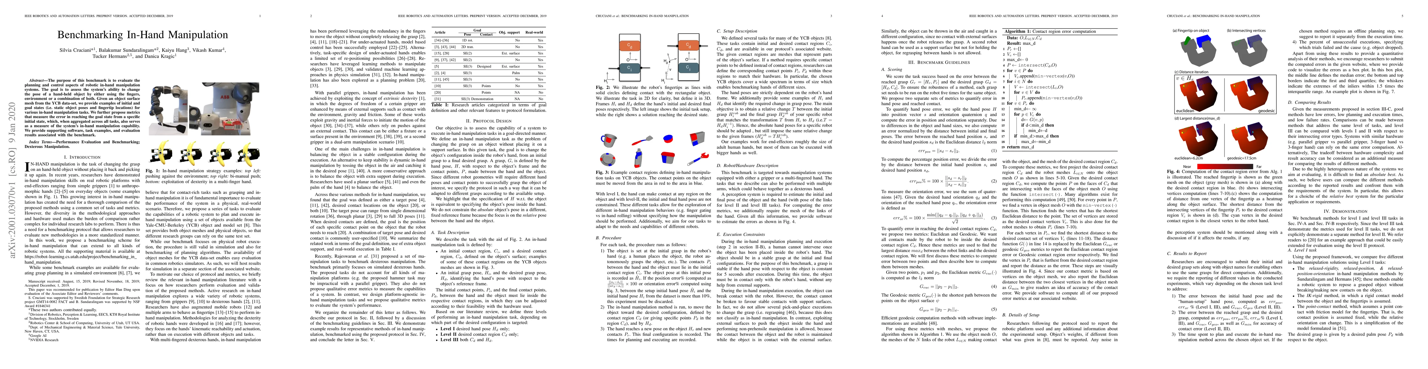 This paper benchmarks robotic in-hand manipulation systems by evaluating their planning and control through various tasks. It proposes metrics to measure performance and provides examples, software, and evaluation results to assess system capabilities.