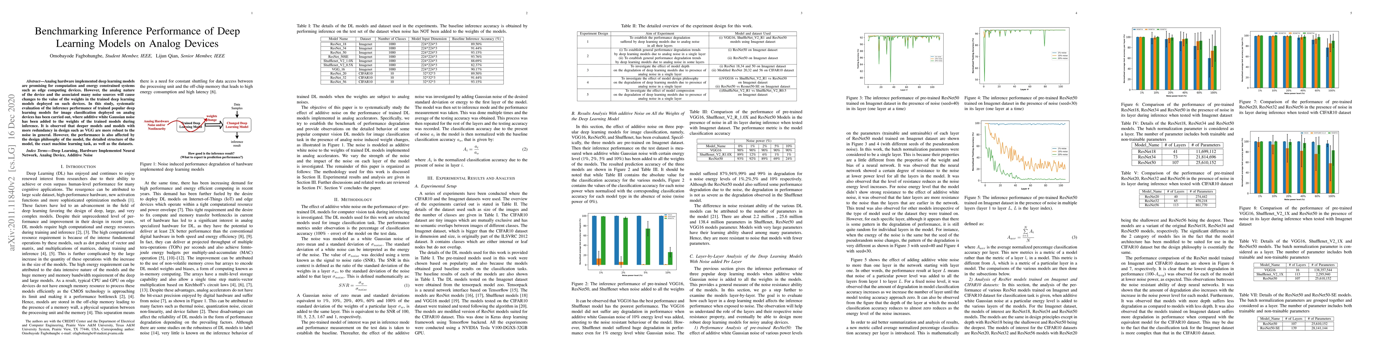 This study benchmarks the inference performance of popular deep learning models on analog devices, finding that deeper models and those with more design redundancy, like VGG, are generally more robust to noise. Performance is also influenced by the model's design, structure, specific task, and dataset used.